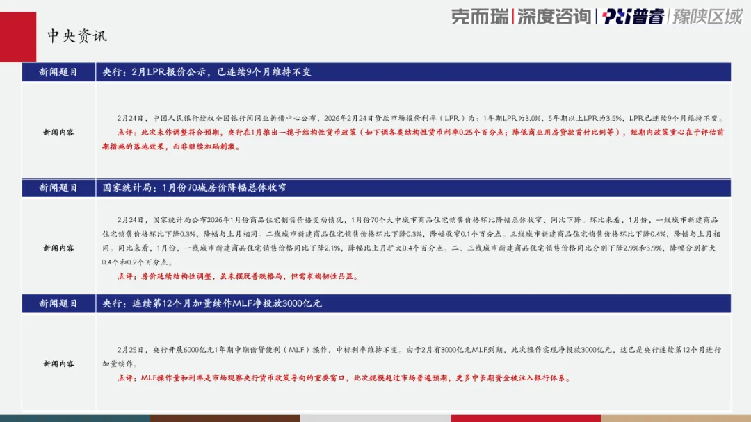 宏观层面:LPR利率持续稳定。2026年2月,1年期LPR为3.0%,5年以上LPR为3.5%,均与此前持平。