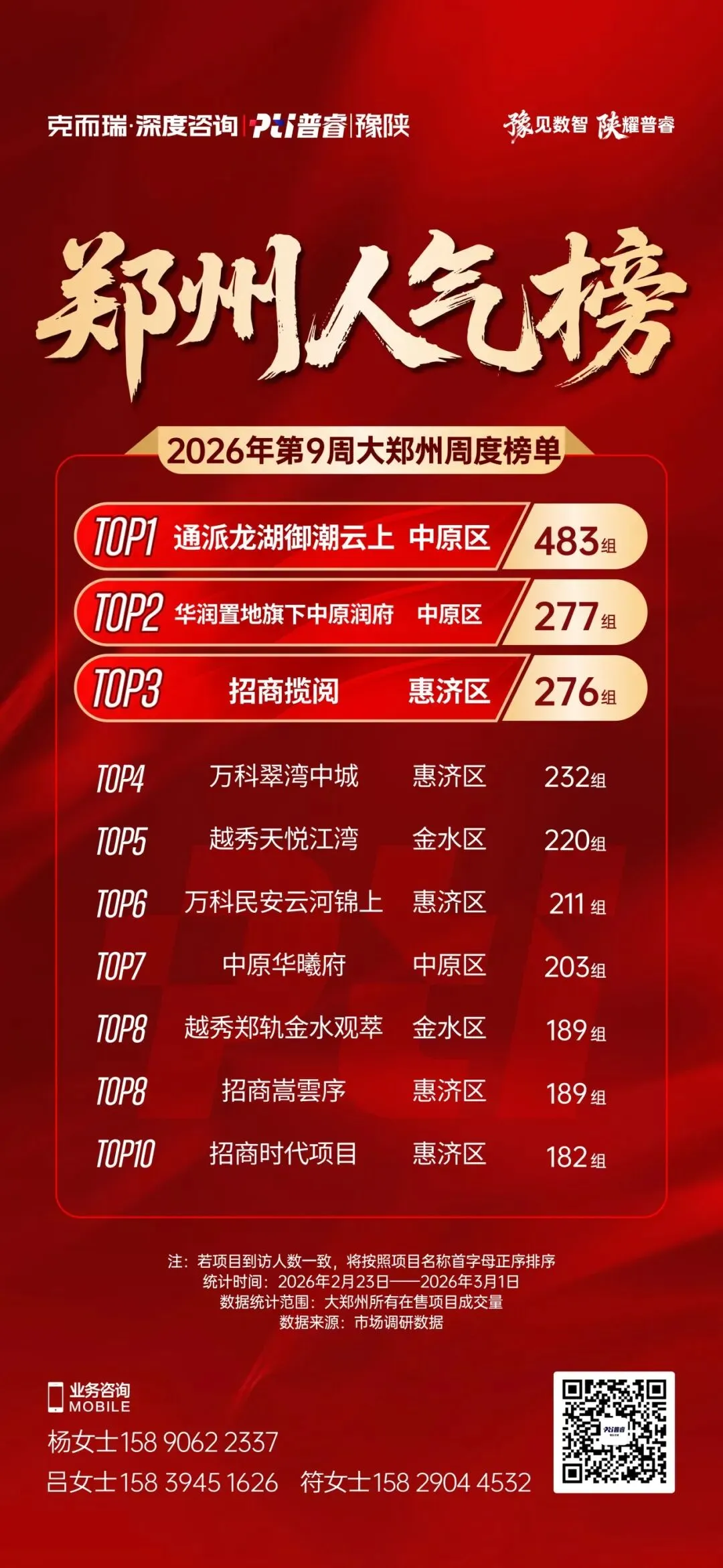春节假期后的第一周,郑州楼市迎来了明显的市场回暖。经历了长假的沉寂,购房者重新开启了看房节奏,开发商也加大了营销力度。在这样的市场背景下,哪些项目成为了购房者的首选?热销榜和人气榜背后,又隐藏了什么样的市场规律?