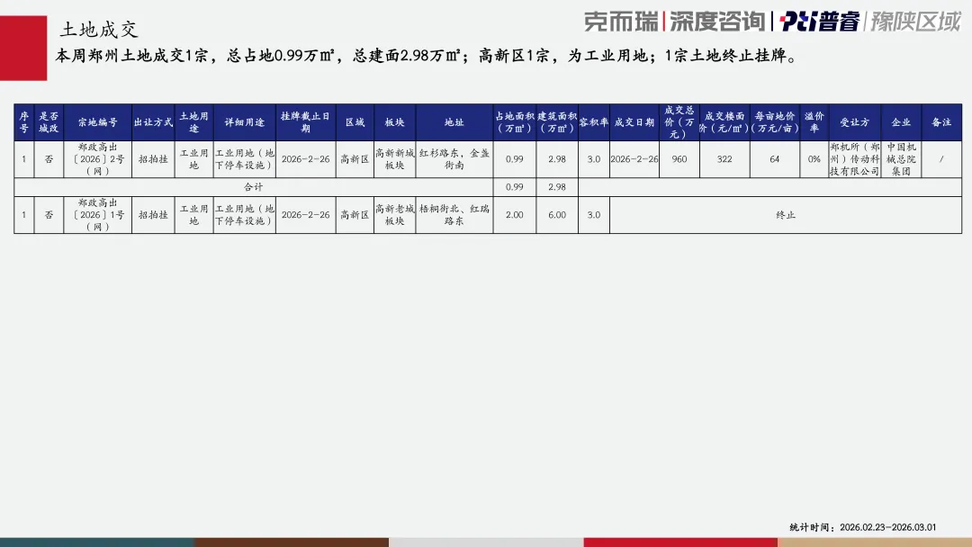 本周郑州土地成交1宗,总占地0.99万㎡,总建面2.98万㎡。成交地块位于高新区,为工业用地,成交价格为3万元/㎡。此外,还有1宗土地终止挂牌。