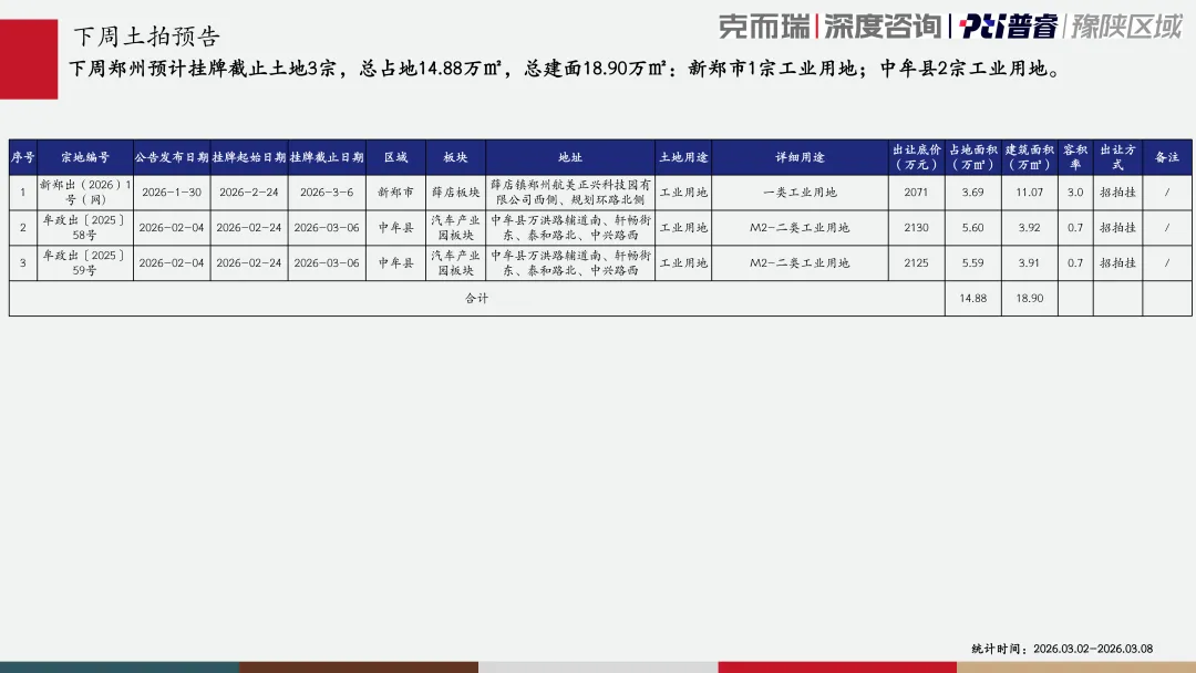 下周郑州预计挂牌截止上地3宗,总占地14.88万㎡,总建面18.90万㎡。均为工业用地。