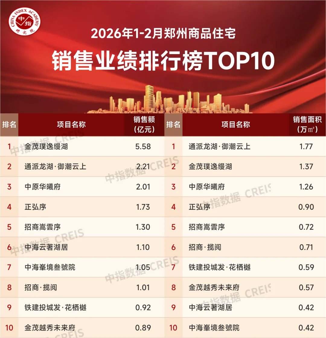 2月,郑州房地产市场呈低位略有修复的态势,市场分化仍较显著,核心区域品质住宅项目到访和成交热度呈回升态势,新开盘四代宅项目持续热销,旧规项目活跃度依然不足。二手房新增挂牌量同环比均大幅减少,新增挂牌均价趋稳,降价抛售情绪继续好转。那么郑州的各个房企在2026年1-2月的销售业绩究竟如何?一起看一下数据表现:https://u.fang.com/ytcrnn/特别声明:房地产企业销售数据统计是以2026年1月1日-2月28日期间销售的商品房为统计口径,包括商品住宅、写字楼、公寓、商业全口径,主要依据中指数据CREIS(点击查看)在郑州市域范围的销售监测数据,并参考当期总体经营情况和推盘去化情况进行分析统计;对于少数没有在监测范围内的企业和项目,由企业提供相关文件,经审核,也纳入统计范围。本报告仅供参考,不对使用报告及其内容所引发的任何直接或间接损失承担责任。2026年1-2月,郑州房地产企业销售金额TOP20企业合计销售金额为39.16 亿元,销售面积为24.28 万平米。其中TOP10房企销售门槛值为1.71亿元/0.99万平米,TOP20上榜门槛值为0.37亿元/0.32万平米。销售金额方面,中国金茂以6.87亿元成为销售金额榜冠军,招商蛇口以3.08亿元位列销售金额榜第二,中国电建地产以2.80亿元位列第三位;销售面积方面,正商集团、正弘置业和中国电建地产分别以2.53万平米、2.21万平米和2.06万平米位列榜单前三位。特别声明:各房企项目销售数据统计是以2026年1月1日-2月28日期间销售的商品住宅为统计口径,主要依据中指数据CREIS(点击查看)在郑州市域范围的销售监测数据,并参考当期总体经营情况和推盘去化情况进行分析统计;对于少数没有在监测范围内的项目,由企业提供相关文件,经审核,也纳入统计范围。本报告仅供参考,不对使用报告及其内容所引发的任何直接或间接损失承担责任。