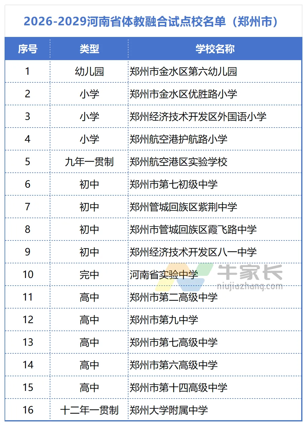 这些学校由河南省体育局、教育厅联合评选,在体育教育方面各具特色,涵盖多元项目,注重“学练赛一体化”发展。以下为郑州市入选学校: