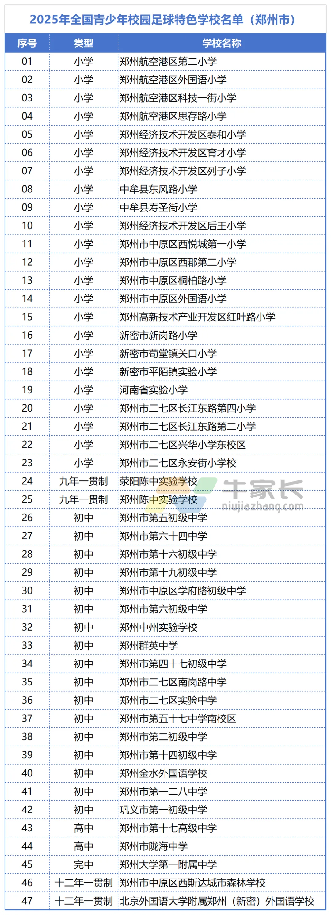 全国青少年校园足球特色学校由教育部每年组织评选一次,旨在普及校园足球、夯实人才根基。以下为2025年度郑州市入选学校:
