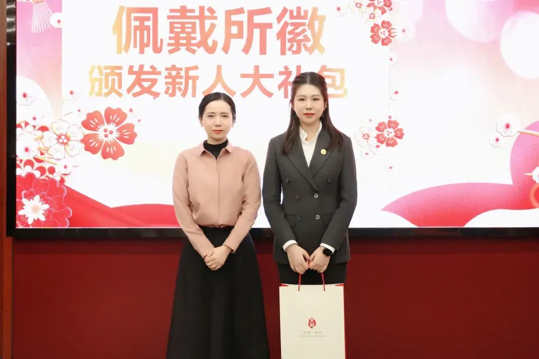 京师郑州律所参政议政委员会主任郭航律师为新入职同仁佩戴所徽并颁发新人大礼包,每一枚徽章都承载着京师郑州对新伙伴的欢迎与期许,也象征着携手同行,共赴法治理想的全新起点