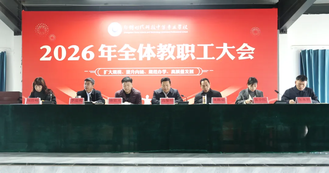 3月3日下午,郑州时代科技中等专业学校2025-2026学年第二学期开学全体教职工会议在报告厅三楼召开。党支部书记徐宏义、校长高黎明等校领导出席会议,全体教职工参会。本次会议以 “凝心聚力启新程 笃行实干谋发展” 为主题,全面部署新学期重点工作,统一思想、凝聚共识,为学校高质量发展谋篇布局、凝心聚力。