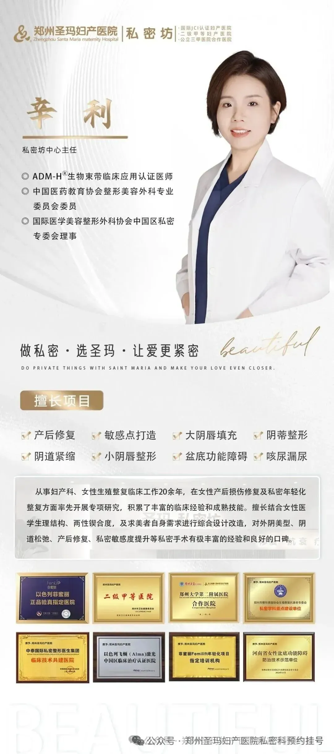 偶然得知郑州圣玛妇产医院私密科辛利主任,她有十余年产后康复临床经验,是私密整复医美学科带头人,还是ADM-H 生物束带临床应用认证医师,深耕盆底障碍性疾病诊疗,诸多专业资质加持,让我瞬间有了底气。