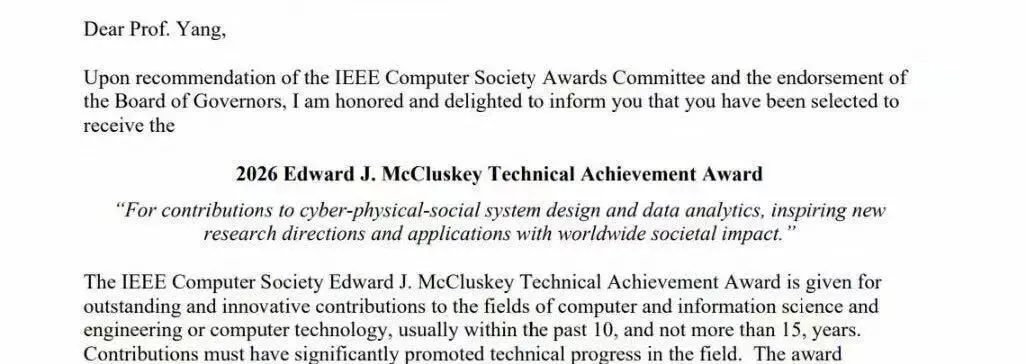 据悉,杨天若教授此次获奖的官方评价是:“For contributions to cyber-physical-social system design and data analytics, inspiring new research directions and applications with worldwide societal impact.”(表彰其在人机物智能系统设计与数据分析领域所作出的杰出贡献,这些贡献开拓了具有全球社会影响力的新研究方向与应用场景。)这不仅是对其个人在计算机科学领域长期深耕、锐意创新所取得一系列国际领先成果的高度认可,更标志着其研究成果已跻身全球计算科学发展的关键贡献序列,对于提升我国在相关领域的国际学术影响力具有积极意义。