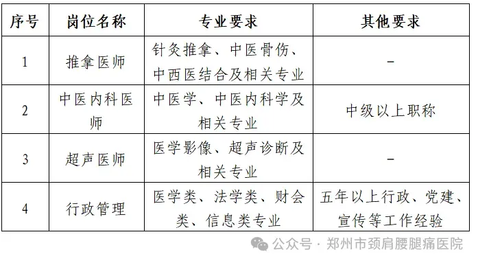 本次招聘公告经郑州市颈肩腰腿痛医院网站(https://www.ache.com.cn/)、郑州市颈肩腰腿痛医院微信公众号及郑州市颈肩腰腿痛医院今日头条号发布。