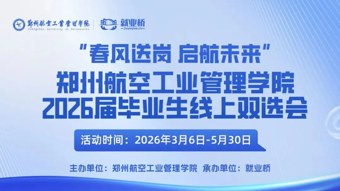 “春风送岗·启航未来”郑州航空工业管理学院2026届毕业生线上双选会:汇聚名企优岗,直通春季招聘。借助本次活动汇聚春季招聘优质岗位资源,通过线上双选会实现简历一键投递、供需精准匹配,让你与HR实时沟通,高效锁定心仪席位!