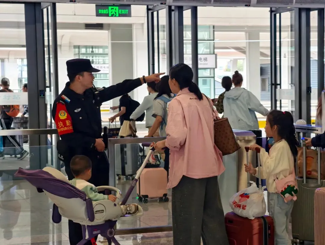 故事:候车厅内,民警正在为推婴儿车的旅客指路,耐心细致地解答。