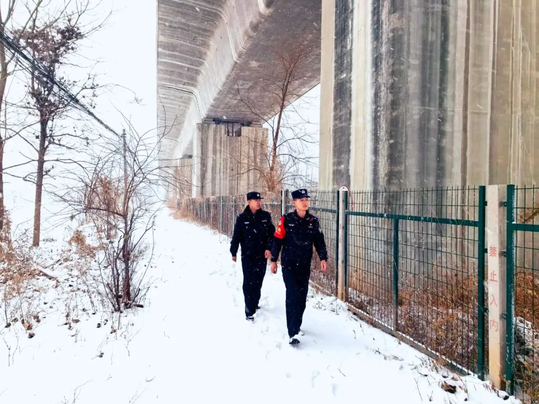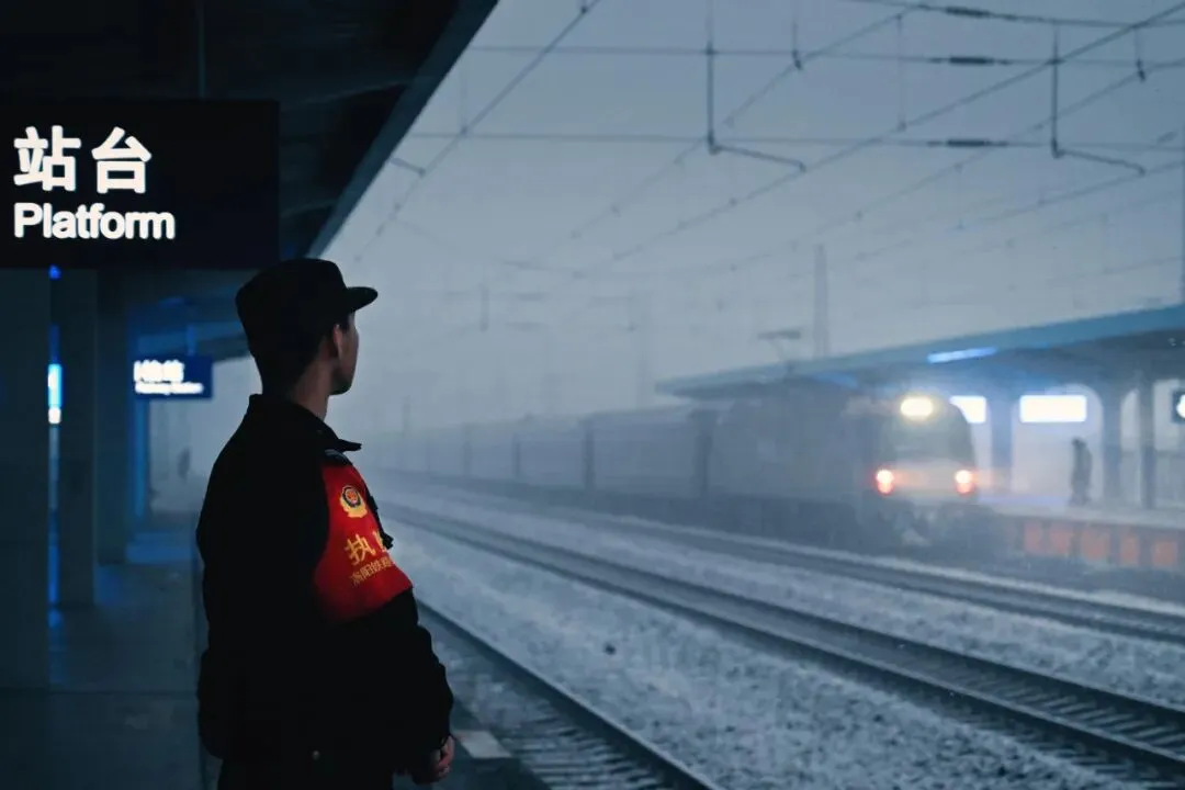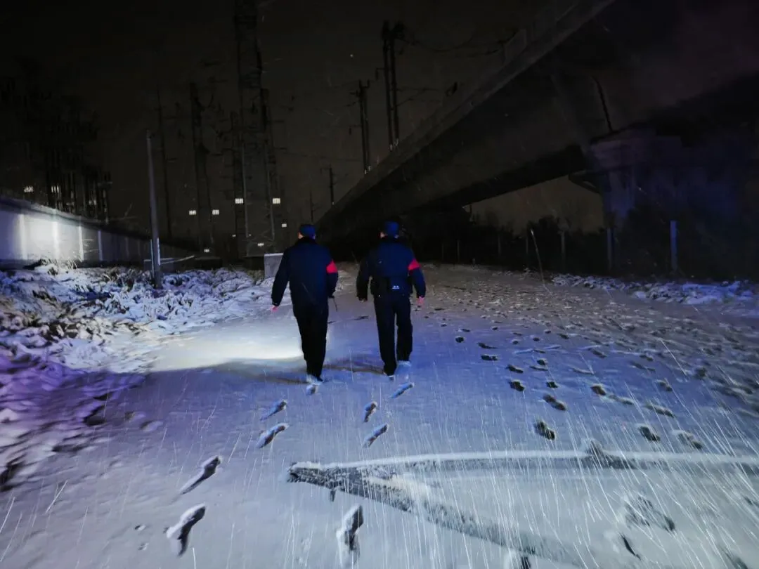 故事:冬夜风雪漫卷,民警踏碎积雪,在高铁线路旁坚定前行,他们用藏蓝身影守护着春运线路的平安,每一步都写满了对万家灯火的守护。