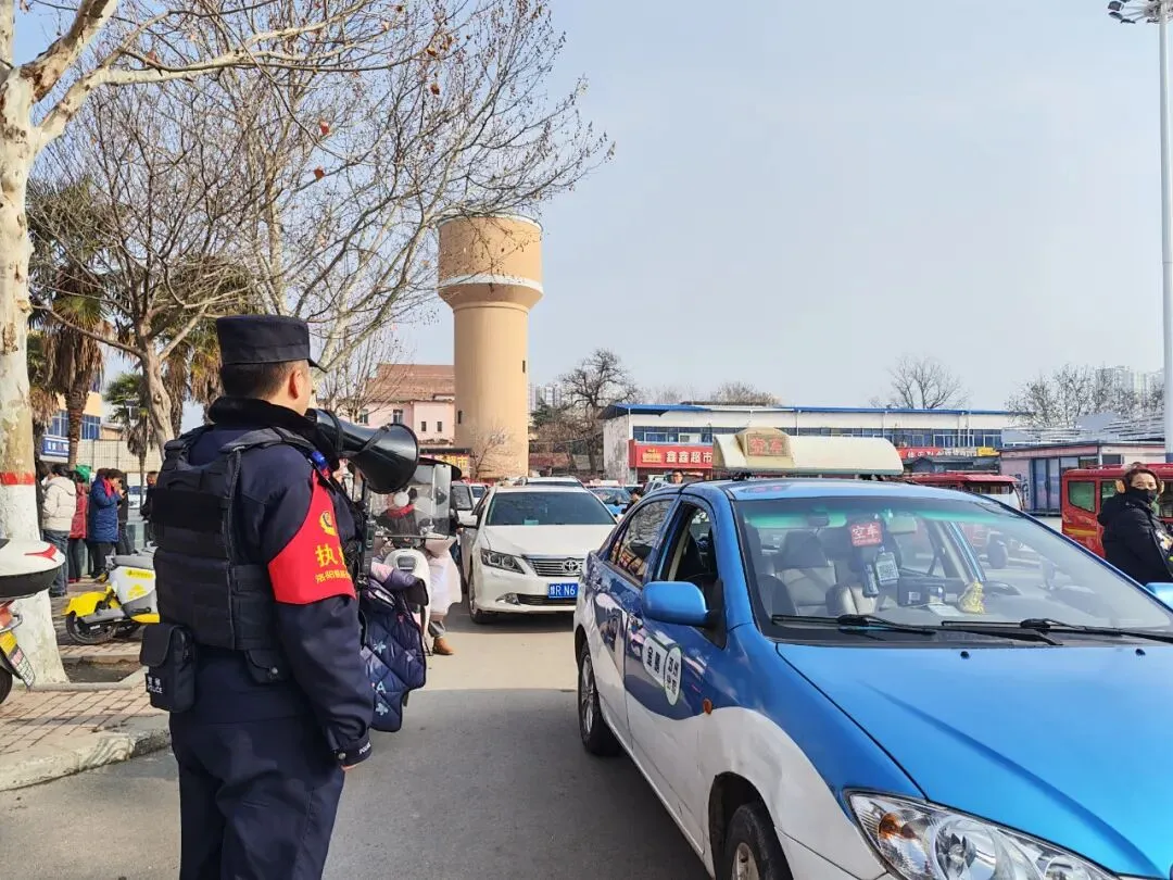 故事:春运期间,邓州站派出所民警在站区疏导车辆,确保道路畅通,群众平安出行。