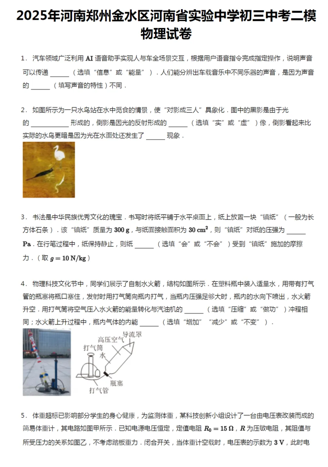 2018-2025学年河南郑州中考二模物理真题及答案解析