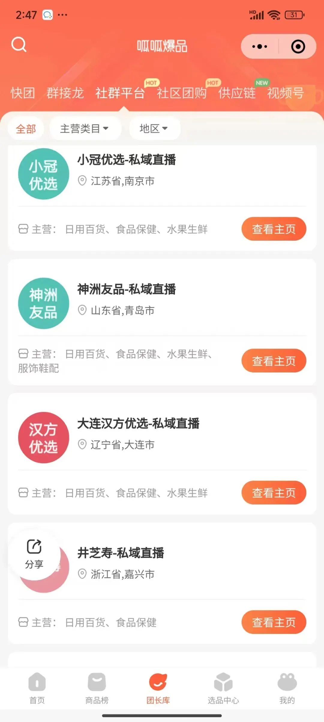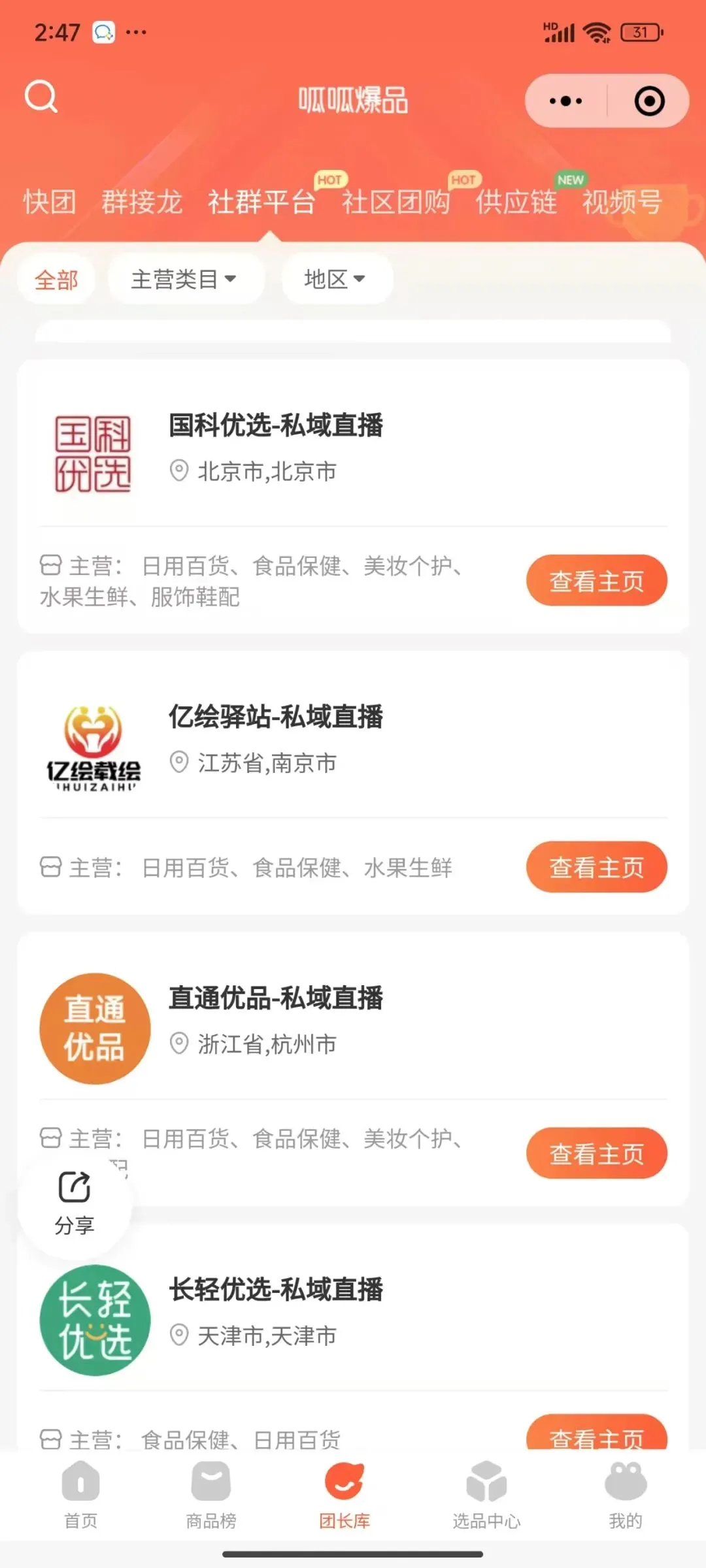 77、洪状源农产品、云爸严选、小蒋(批发供应链)、泡妈、BMCLUB、骄傲市集、小马的美好生活、LoveMommy团、贝壳板娘、群有惠、乐购社团一站式、Lily's生活馆2号、蜜瓜、七浓热选、今生、宇哥有点儿东西、丹丹老师、胡蝶网红集中营、黄大美、仟果满分、萌哒萌哒二酱、沅贵妃美食团、Autumn、优品社、关关Optimization、Angel、壹食光、塔莎的花园、小君JUN优选、GO嗨优选、灵小片、佳佳酱ya、凌云礼品、 Rose 、花园匠心、季念品麻麻、ATM 实验室、W姐石魏宁、买山的厨房、五仁好物、Susan老师、建利严选、阿莫玲、任冉、Thera的生活廚房、小酒、好妈、席子米米、悦涵鲜花、刘小姐·优选、M&J团、爆米花大大、萌哒萌哒哒酱、花儿朵朵、忠俊2号、董小姐、欢子、小蜜优果、仙花嫁到、NiuNiu、小羽毛、花团有花、农科院官方、常常的花园(生活美食馆)、初见郑薇、 爱美丽的小羽毛、理山食集、食尚厨语、Lola、彩虹桥—品质生活馆、花宜宾朴林、华姐姐、美妆大王、pigmm、米糖、斗不斗、魔都三辣妈、圆妈、姐姐们的厨房、海鲜大叔、悦团、萌萌萌萌萌虎、朝霞严选、食野、 Sam哥等……