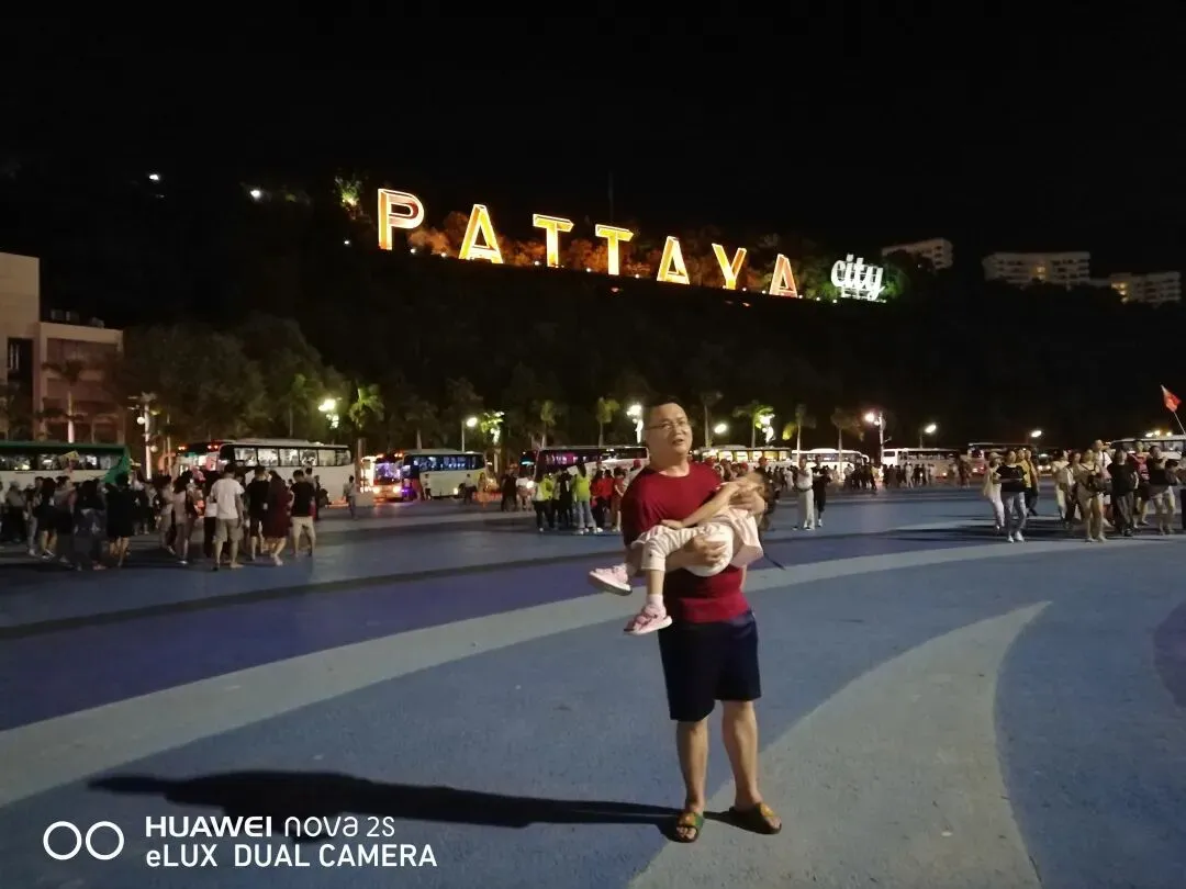 在泰国芭提雅广场前,我女儿睡着了,我老公抱着她
