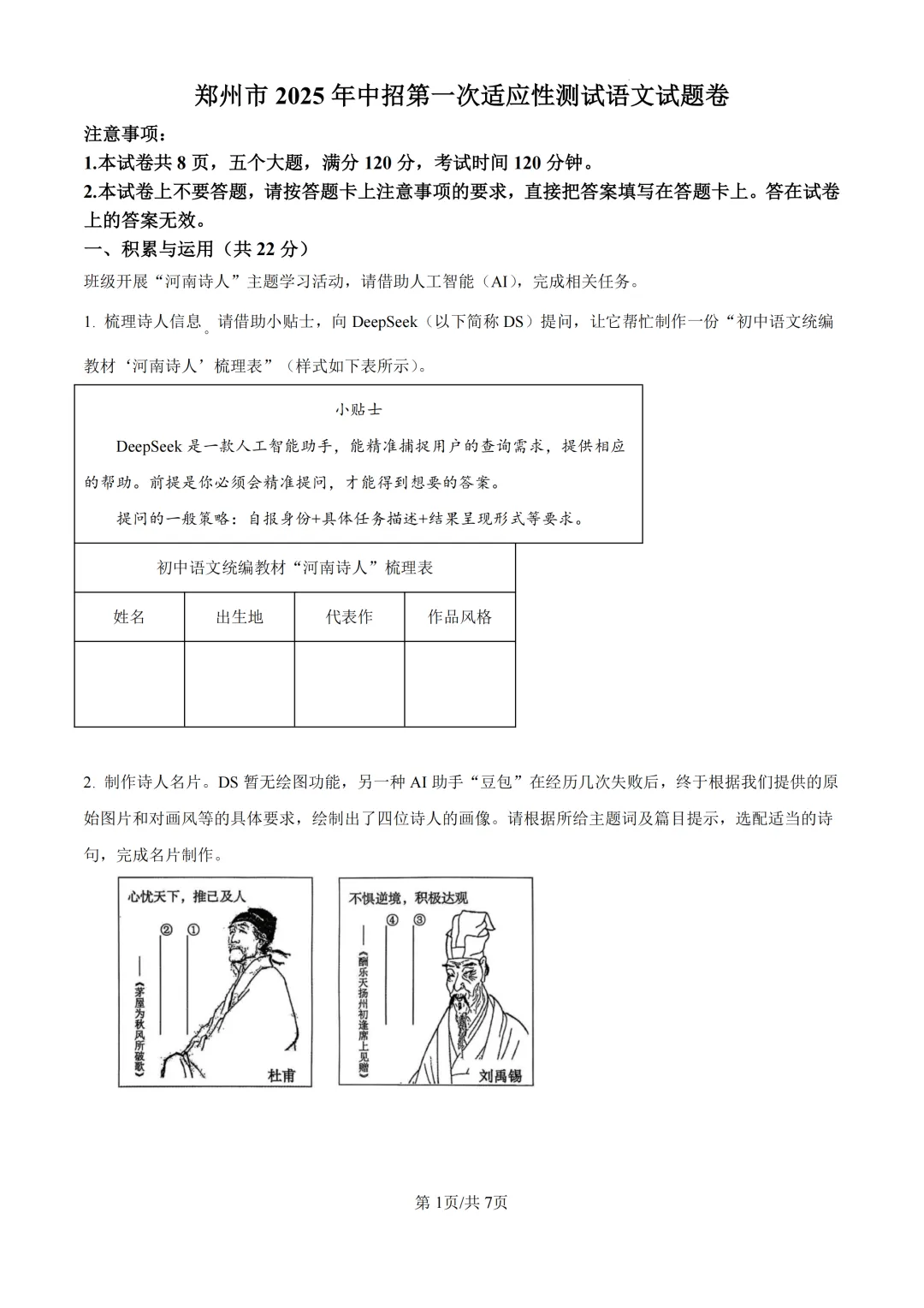 试卷结构严谨,全面考查了‘积累与运用’(人工智能工具使用)、‘阅读与鉴赏’(记叙文、议论文、文言文、古诗词)、‘整本书阅读’与‘作文’。基础题如字音字形是得分点;难点在于高阶思维与综合探究题目,如运用AI进行主题学习与结果反思、分析‘成长蜕变’的双关意蕴、辨析网络标点使用的异同、赏析《出师表》与诸葛亮的忠诚与谨慎、解读《浣溪沙》的时空矛盾与情感,以及对名著矛盾冲突的深层解析,对学生的批判性思维、信息整合、文化理解与创意表达能力提出了系统性的极高要求,体现了卓越的选拔功能与育人价值。<点击图片查看全卷>