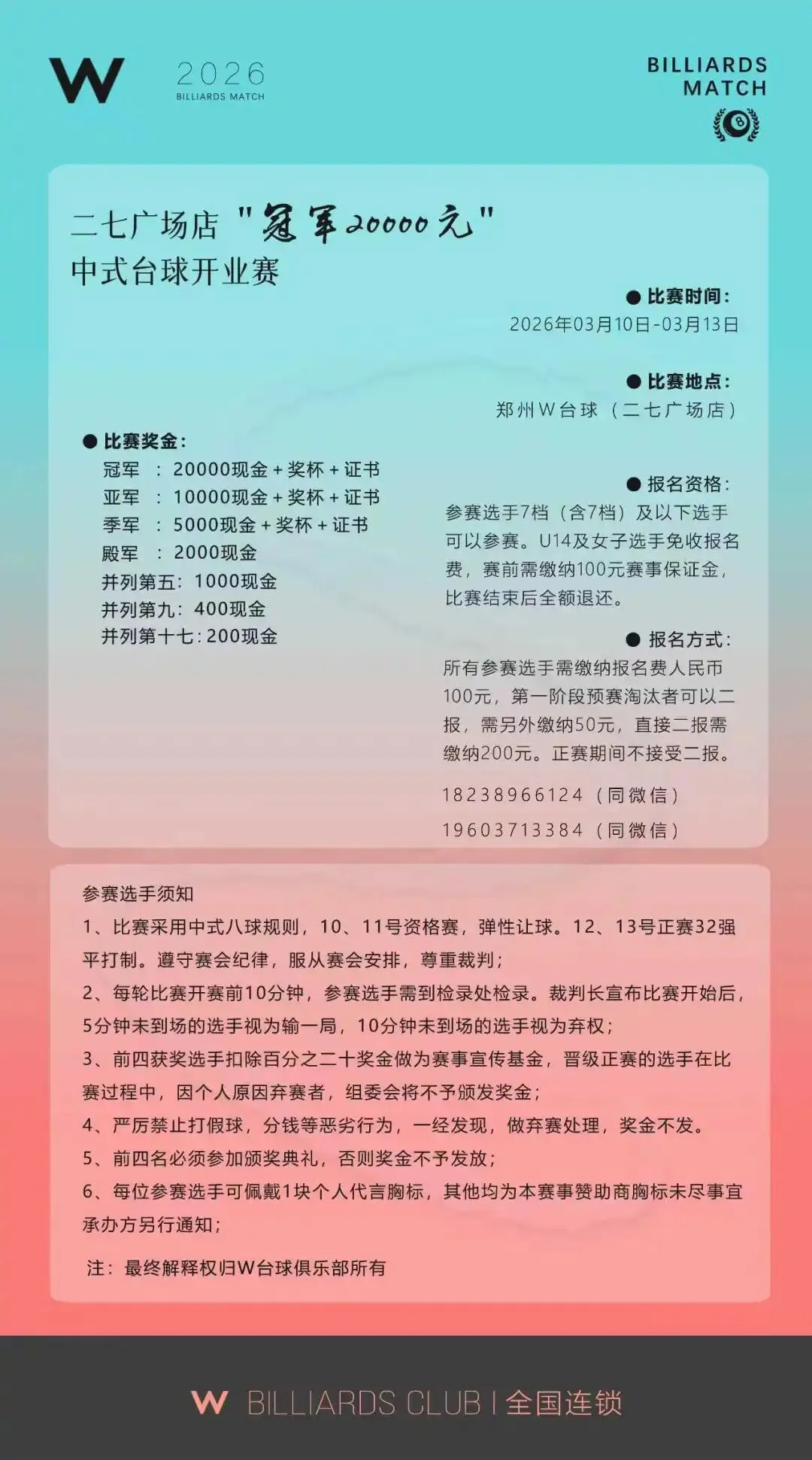 2、比赛地点:郑州市二七区二七广场百年德化风情购物公园西口3楼。3、U14及女子选手免收报名费,赛前需缴纳100元赛事保证金,比赛结束后全额退还。1、比赛采用中国台球协会颁布的《中式台球竞赛规则》。2、比赛让球:预选赛全程弹性让球(最高让后3),U14及女子选手,正赛1/4之前比赛均受让后一球起。1/4比赛至决赛均不再让球。3、比赛分为预赛和正赛两个阶段。预赛采用8人小组弹性让球双败赛,取前32名进入正赛,正赛采用32强双败。1、报名时间:截止至2026年1月10日上午11点。3、抽签时间:2026年1月10日上午11:30。4、抽签地点:郑州W台球俱乐部三店。5、比赛时间:2026年1月10日中午12点。八、报名费用1、所有参赛选手需缴纳报名费人民币100元,第一阶段预赛淘汰者可以二报,需另外缴纳50元,直接二报需缴纳200元。正赛期间不接受二报。4、本次公开赛不设置外卡选手,不设置助教摆球服务。2、参赛运动员自备比赛服装,进入正赛的运动员必须穿着衬衣马甲西裤正装深色皮鞋,运动员比赛期间食宿及交通费用自行承担。3、运动员须身体健康并自行办理保险事宜,运动员在比赛期间产生的意外伤害,赛事组委会均不承担责任。4、参赛球员服装胸前或后背必须粘贴赛事承办方认可的标识。参赛选手须按赛会要求着装,服装不符合要求的禁止参赛。进入前八名的选手必须参加颁奖典礼,奖金不可代领。5、每轮比赛开赛前10分钟,参赛选手需到检录处报到。裁判长宣布比赛开始后,未到场的选手视为弃权。6、若对当执裁判判罚不服,申诉须在判罚后双方选手下一击前提出,否则不予受理。若对裁判员的判罚有异议,可向裁判长进行申诉,对裁判长的判罚有异议,可向仲裁委员会申诉,仲裁委员会的决定为最终决定。7、参赛选手在比赛中出现故意干扰对手等有违体育道德行为,将会受到警告,情节恶劣者取消比赛资格及成绩。
