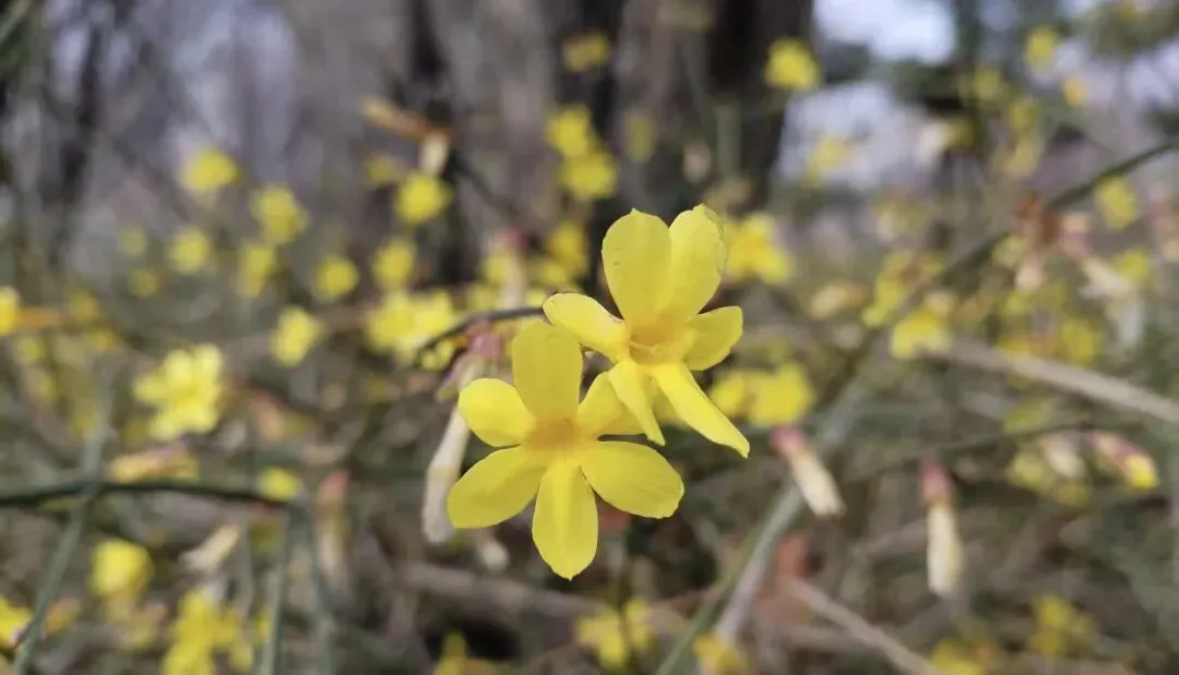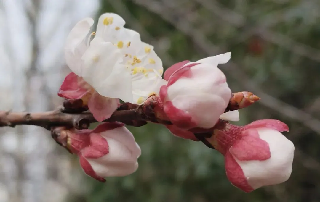 远远地,望见一树淡淡的红妆,那是含苞待放的紫叶李。旁边一簇迎春花,在柔柔的枝条上绽放着,单瓣的、复瓣的,一样安静的乖巧可人。