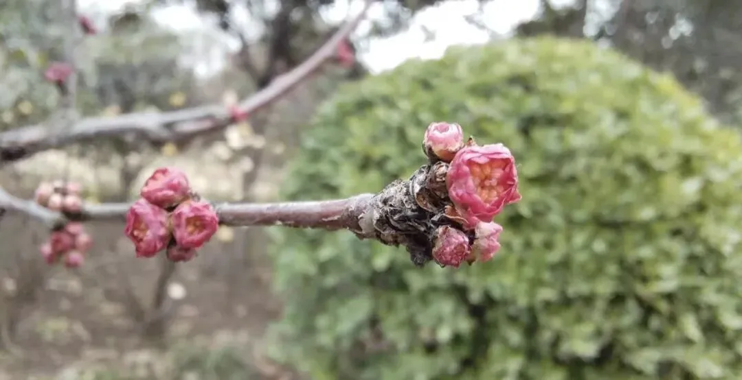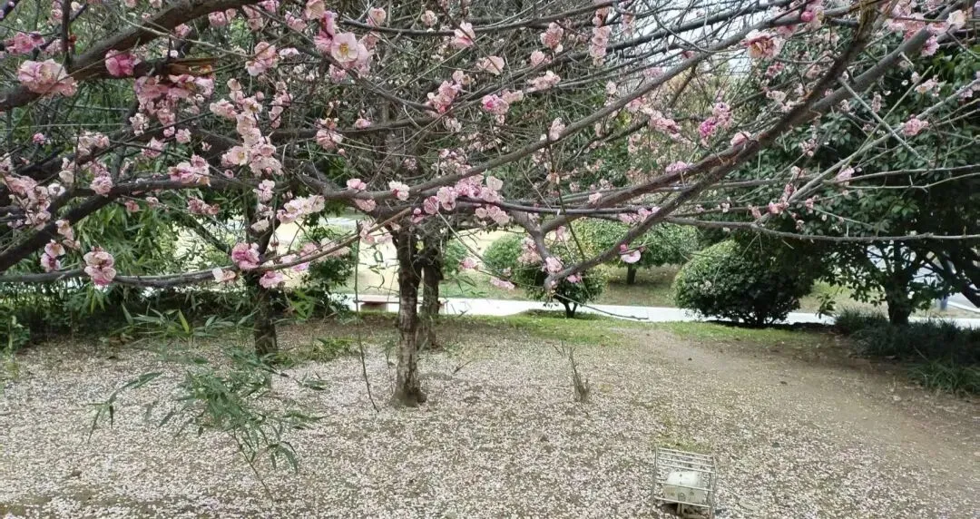 走近些,发现前几天盛放的红梅和白梅,此刻已是“乱花渐欲迷人眼”。树上、空中、地面,浑然一体了。