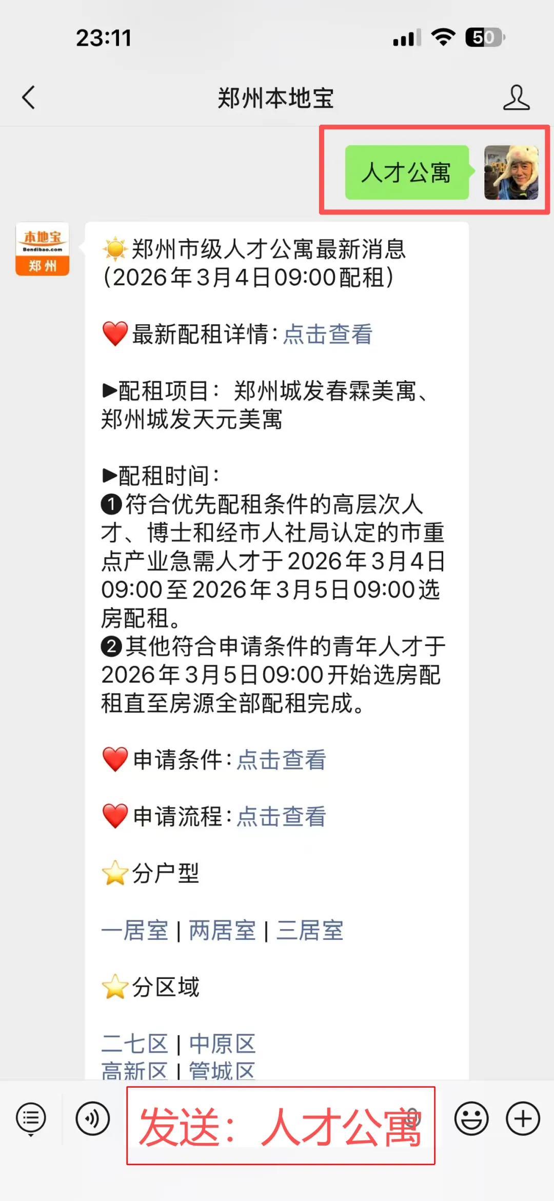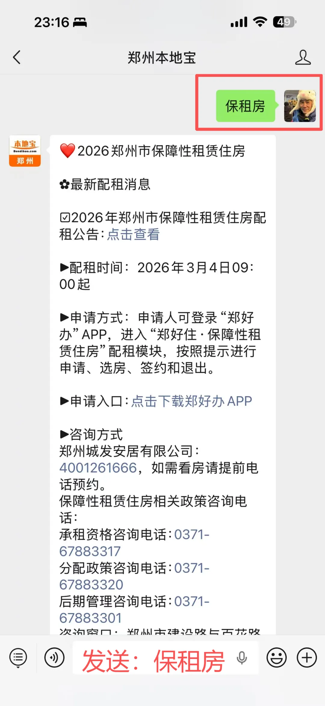 在聊天对话框发送【保租房】