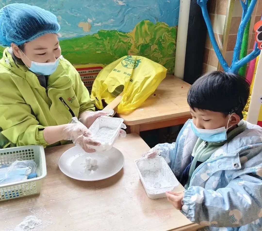 活动伊始,在老师的引导下,家长与幼儿共同体验传统民俗——滚元宵。从蘸水、裹粉到反复滚动,一个个圆润饱满的元宵在亲子协作中慢慢成型。