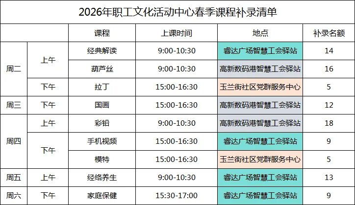春光正好,学习趁早。为了满足更多职工的学习需求,同时将服务触角延伸至职工身边,郑州高新区总工会职工文化活动中心于本学期推出“分散式教学”模式,课程不再集中于单一地点,而是走进辖区多个工会驿站,方便大家就近学习。课程开课在即,现有少量名额可报名,赶快抓住最后的机会,选择离你最近的驿站报名吧!