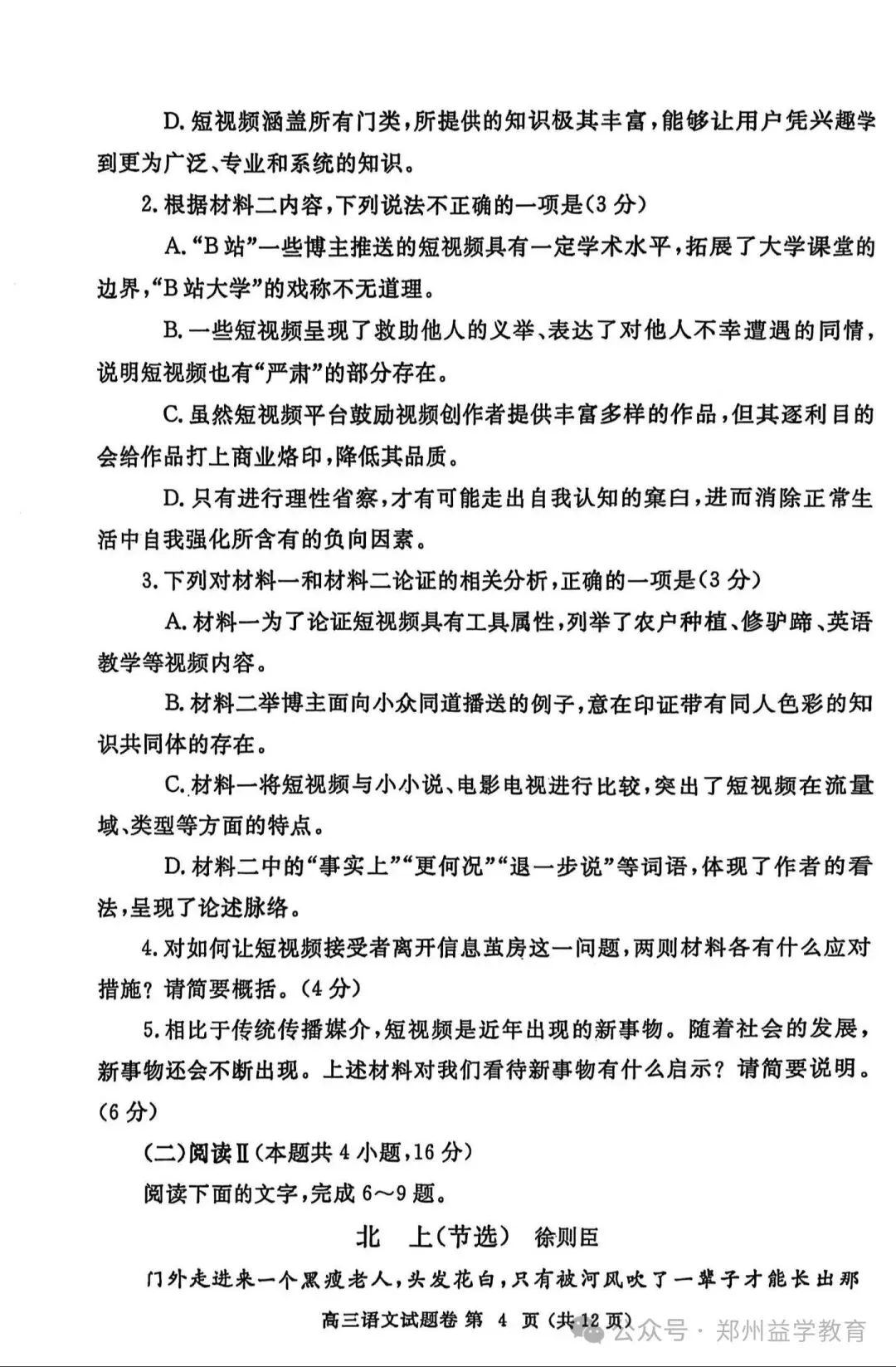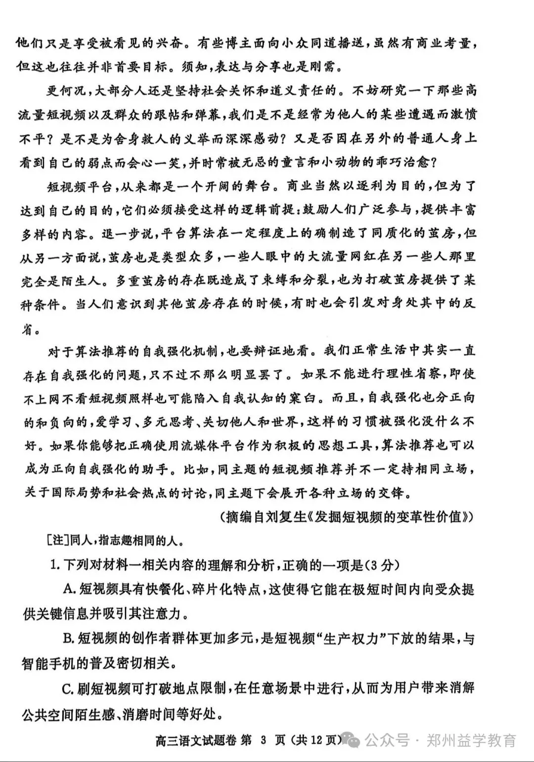 3.(3 分)D(A 项事例与观点不匹配。“农户种植、修驴蹄、英语教学等视频内容”,