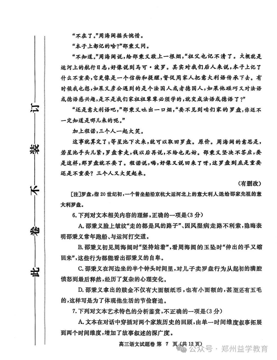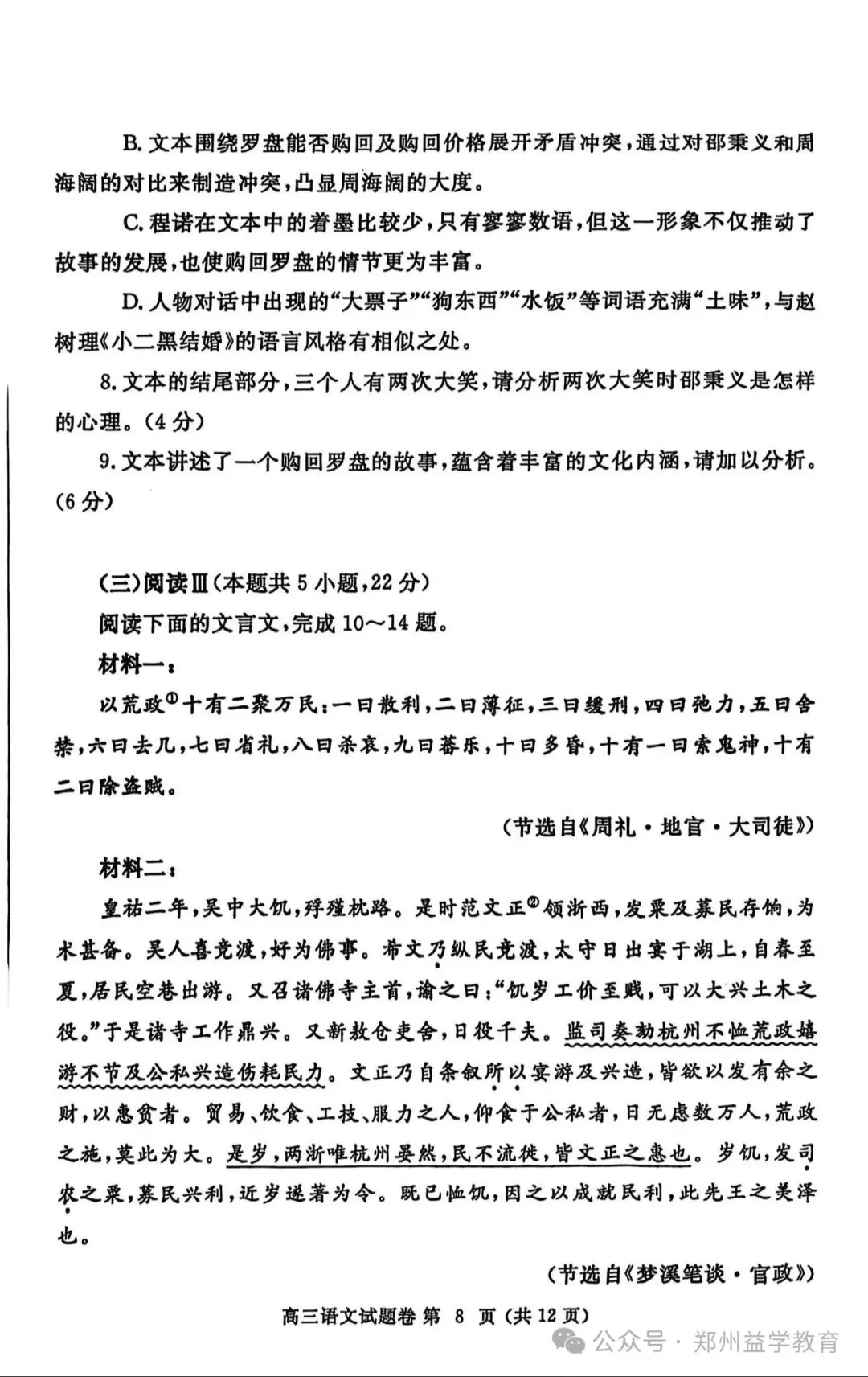 7.(3 分)B(“通过对邵秉义和周海阔的对比来制造冲突”说法有误。文本并非通过