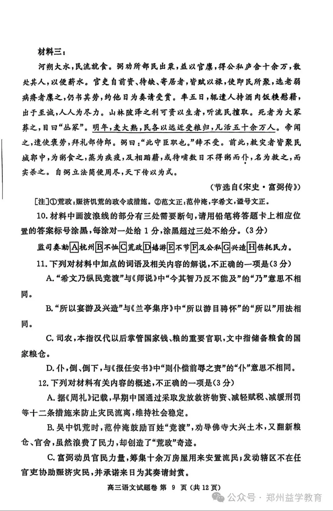 12.(3 分)B(“虽然浪费了民力”说法错误,这是“监司”弹劾范仲淹的说辞。文中