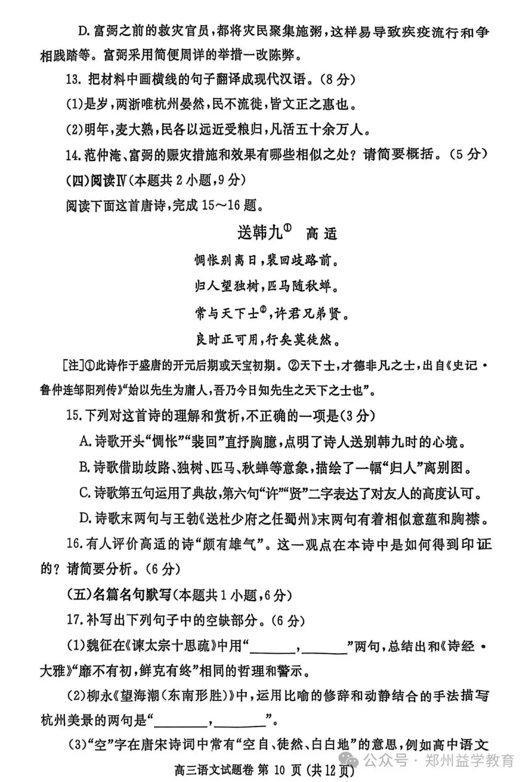 15.(3 分)D(“有着相似意蕴”说法有误,本诗末两句的“意蕴”是激励友人大展