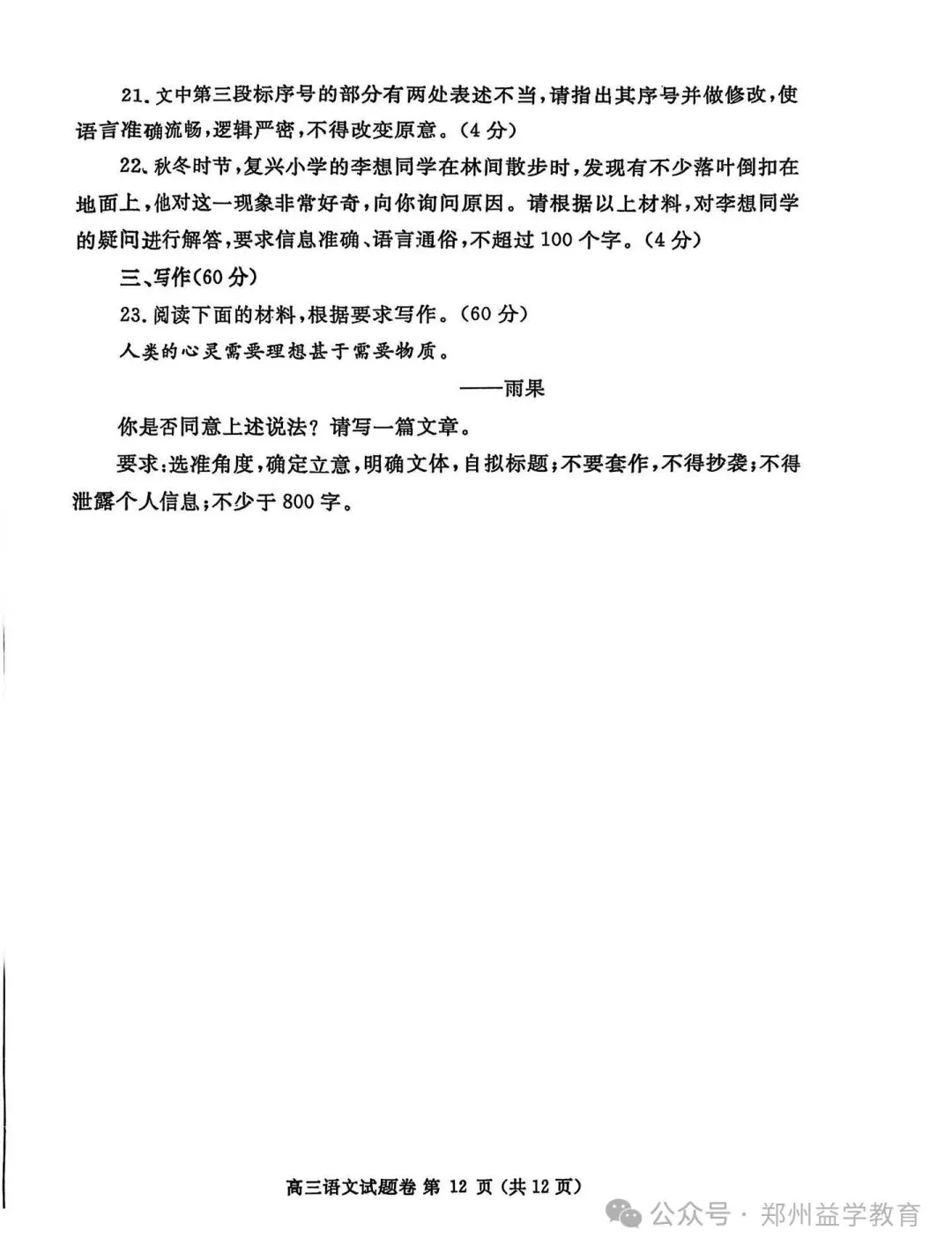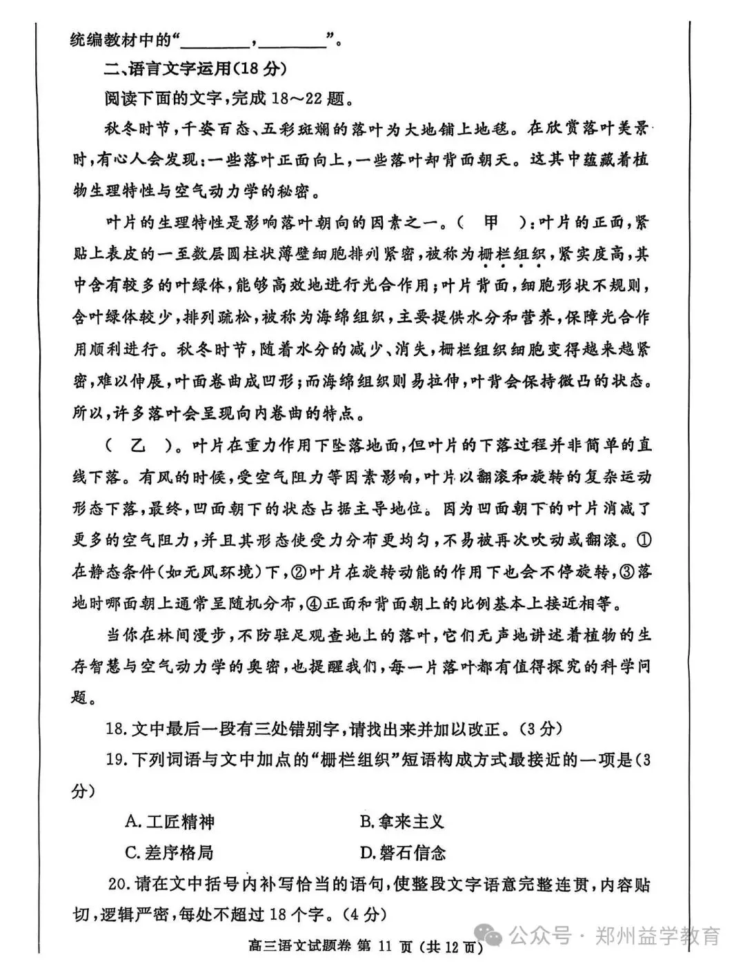 19.(3 分)D(D 项和文中加点的“栅栏组织”都是由“运用了比喻修辞的名词+名词”
