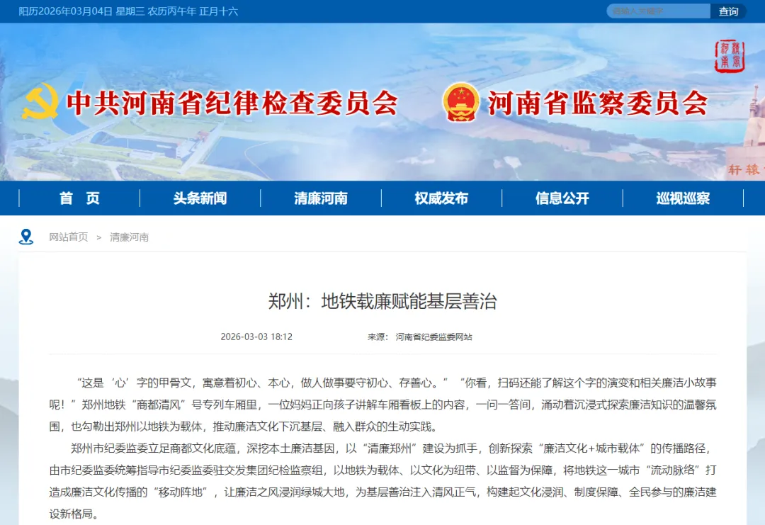 郑州市纪委监委立足商都文化底蕴,深挖本土廉洁基因,以“清廉郑州”建设为抓手,创新探索“廉洁文化+城市载体”的传播路径,由市纪委监委统筹指导市纪委监委驻交发集团纪检监察组,以地铁为载体、以文化为纽带、以监督为保障,将地铁这一城市“流动脉络”打造成廉洁文化传播的“移动阵地”,让廉洁之风浸润绿城大地,为基层善治注入清风正气,构建起文化浸润、制度保障、全民参与的廉洁建设新格局。