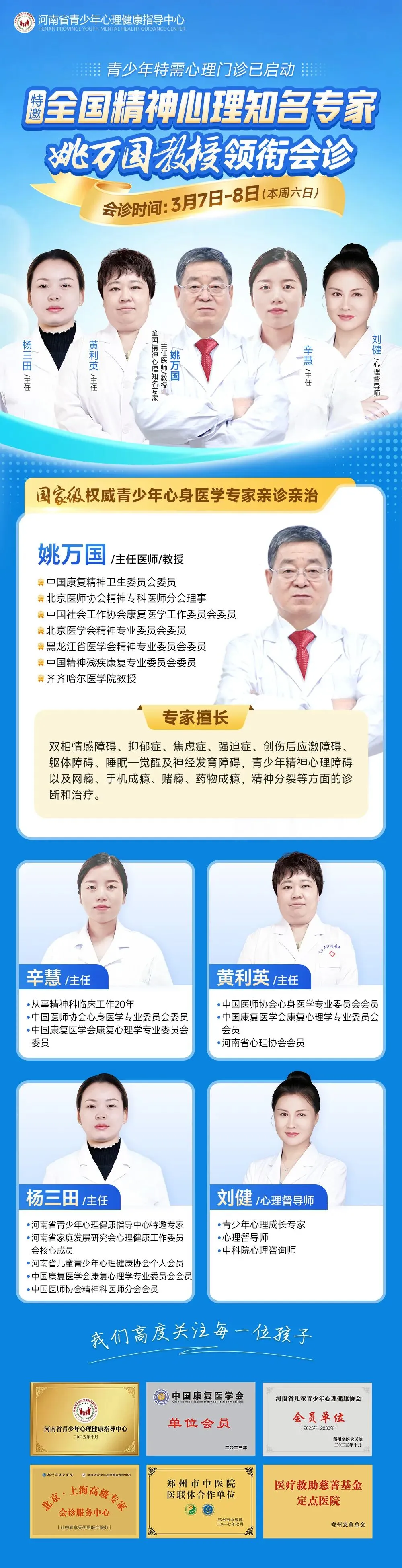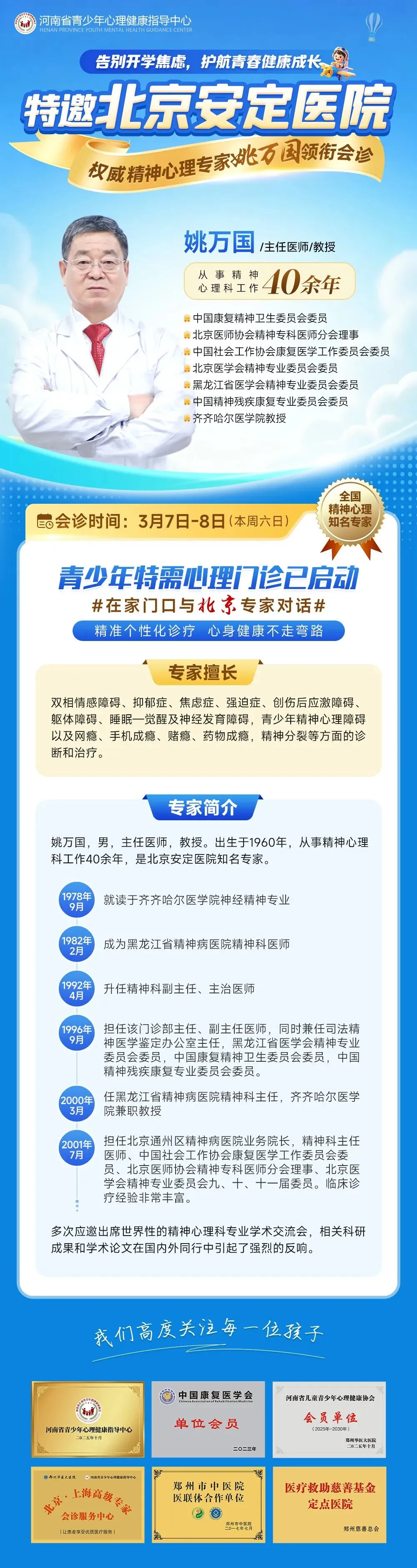 青少年心理问题,早干预、早治疗,恢复效果越好。这也是我们一直致力于搭建优质医疗资源桥梁的初衷——让中原地区的青少年不用跨省奔波,就能享受到北京三甲名医的专业诊疗。本周六日(3月7日-8日),我们有幸特邀北京安定医院知名专家姚万国教授,亲临郑州华医大青少年心理科开展特别会诊行动,为困扰中的孩子和家庭送来希望。