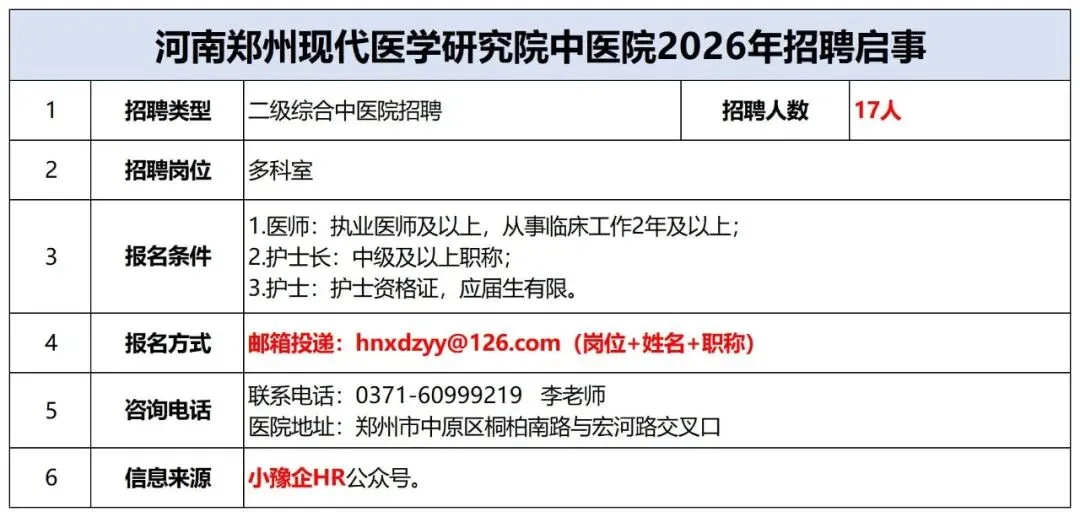 >河南郑州现代医学研究院中医院2026年招聘17人