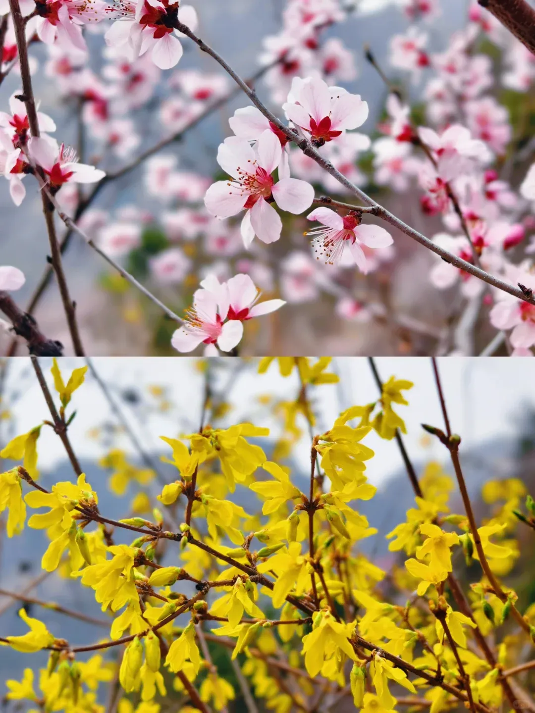 金黄的连翘率先登场,一丛丛、一簇簇,点亮了整个山谷。紧接着,粉白的桃花、杏花次第开放。金黄与粉白交织,偶尔还有紫蓝色的芥兰花点缀其间,山野间仿佛打翻了春天的调色盘。