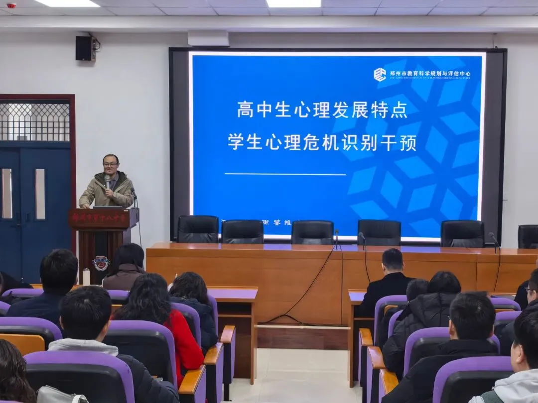 本次培训特邀郑州市教育科学规划与评估中心保健站副站长鲁泉担任主讲。鲁泉深耕心理健康教育20余年,是郑州市心理健康教育领域的资深专家。为期一个半小时的专题培训会上,鲁泉以《高中生心理发展特点及学生心理危机识别与干预》为题,结合丰富的理论研究与实践案例,深入剖析了当代高中生在学习压力、人际交往、情绪管理、自我认同等方面的发展特点与多重挑战。