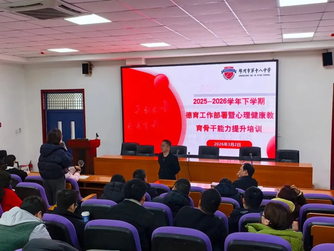 3月2日,郑州市第十八中学举行新学期德育工作部署暨心理健康教育骨干专业能力提升培训会议。学校校长来松涛、副校长张恺及全体班主任、政教处、团委、德育相关干部等参加培训。