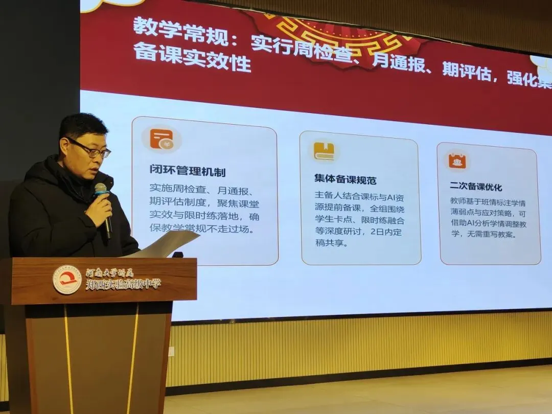“三步走”:开学前三周站稳常规,把课堂立起来,备课要备实、上课要上好、作业要管好;学期中间十周聚焦突破,把质量提上来,教研要做真、课堂要改革、人工智能要用起来、质量检测要发挥真正的诊断功能;学期最后三周精准收官,把成果亮出来,精准复习、教学复盘、做好衔接。