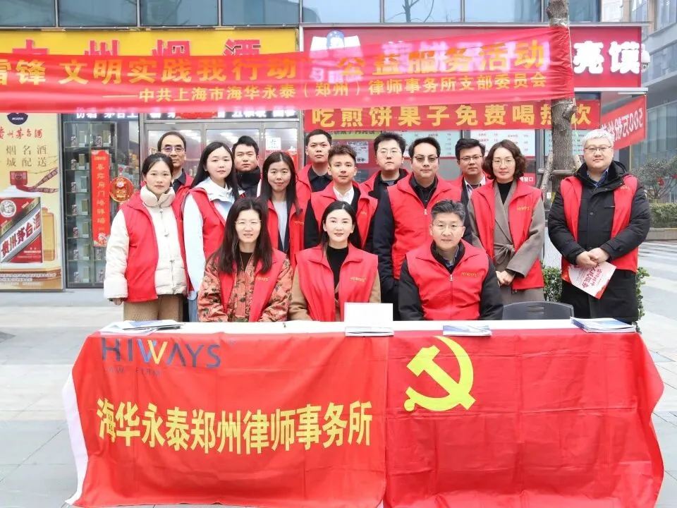为深入弘扬雷锋精神,践行社会主义核心价值观,积极响应郑州市律师行业党委、郑州市律师协会“学雷锋 文明实践我行动”主题活动号召,2026年3月4日上午,上海市海华永泰(郑州)律师事务所党支部组织律所人员,在郑州市绿地新都会6号楼前广场开展了一场公益法律服务活动,以专业力量传递法治温暖,用实际行动诠释新时代律师的责任与担当。