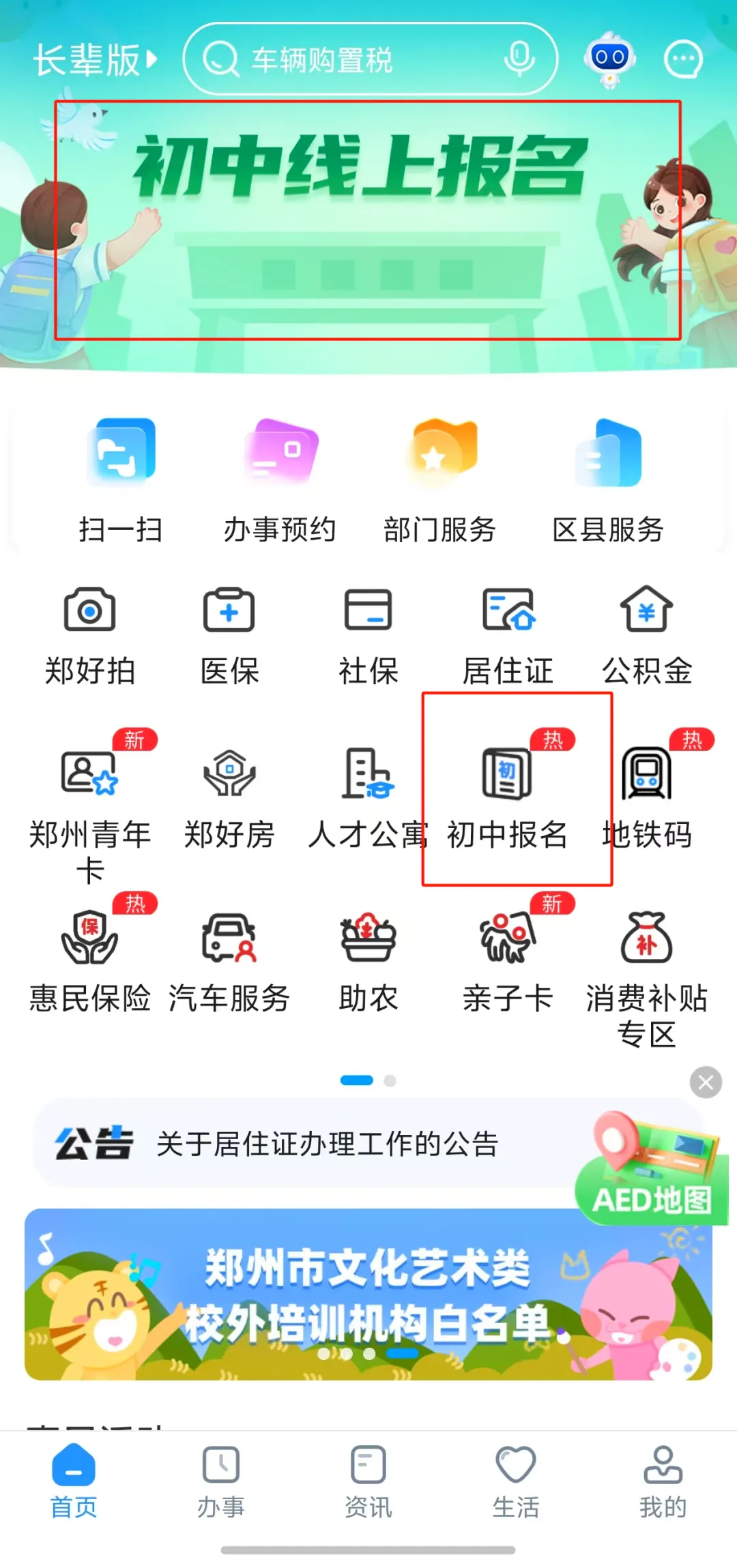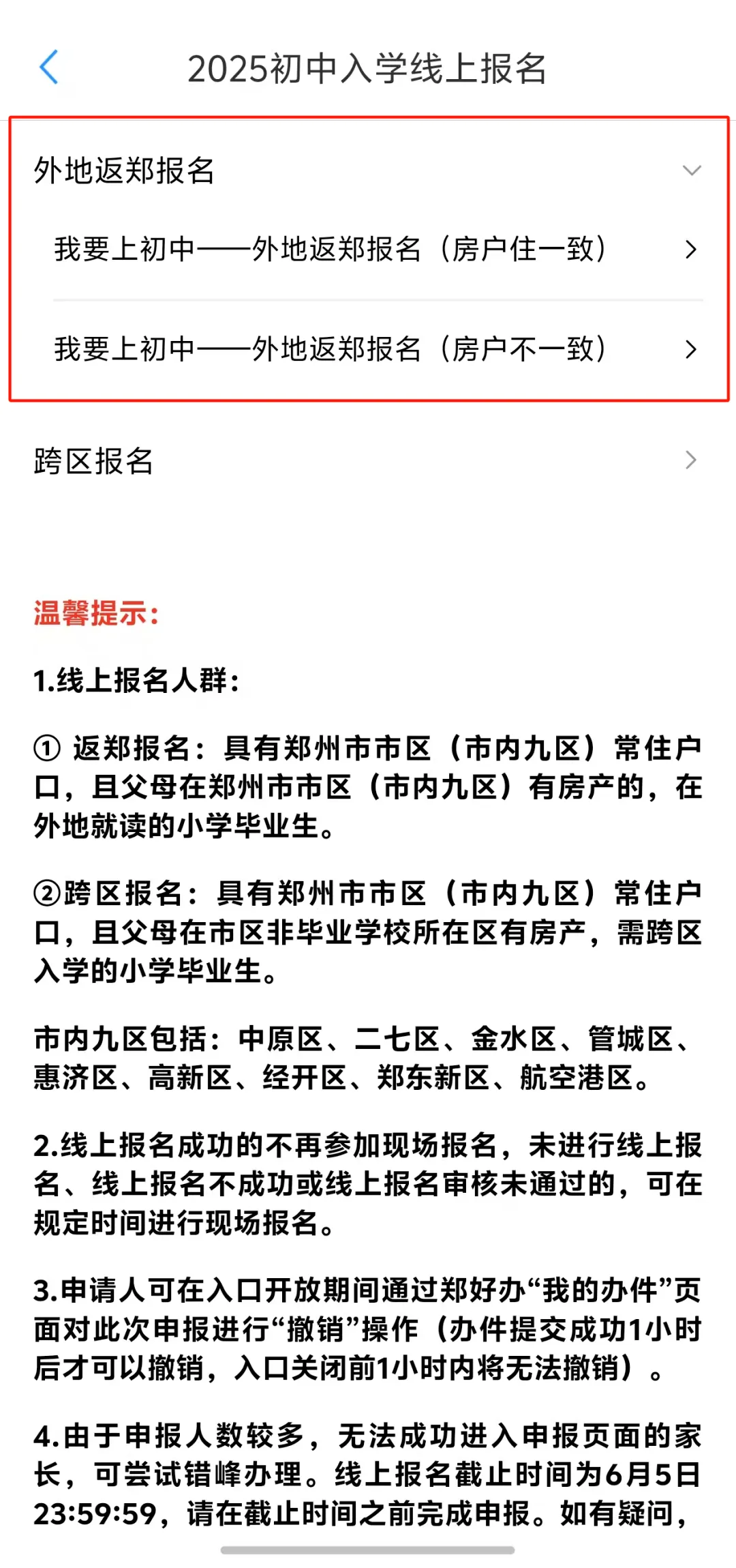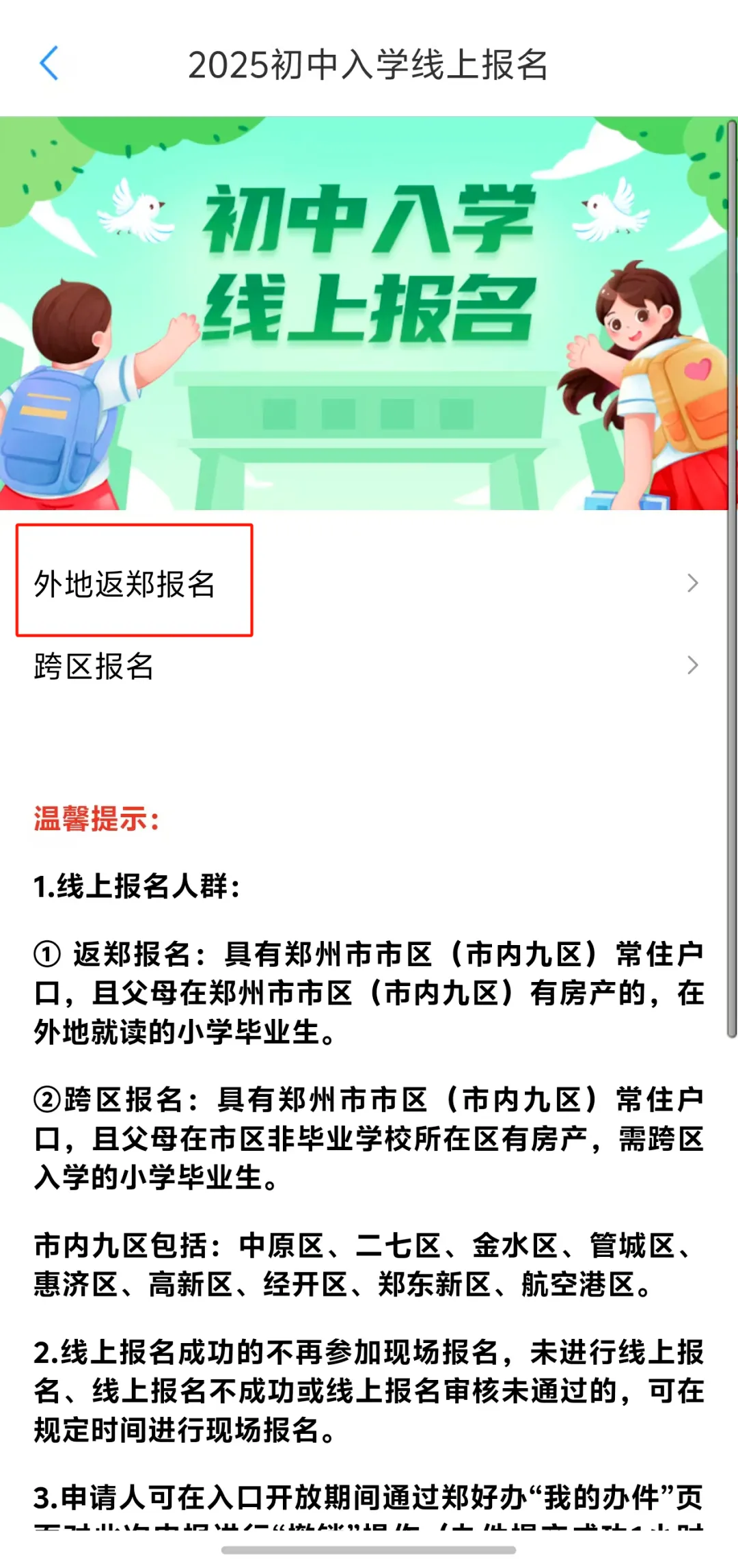 ①登录“郑好办”APP,点击首页“初中线上报名”,选择“外地返郑报名”。