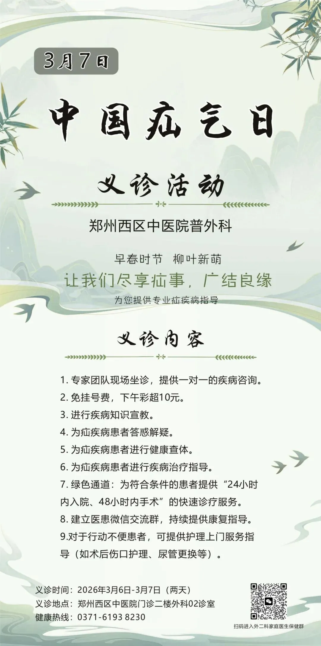 早春三月,柳叶新萌。2026年3月7日是“中国疝气日”,郑州西区中医院普外科将于3月6日-7日举办为期两天的主题义诊活动,