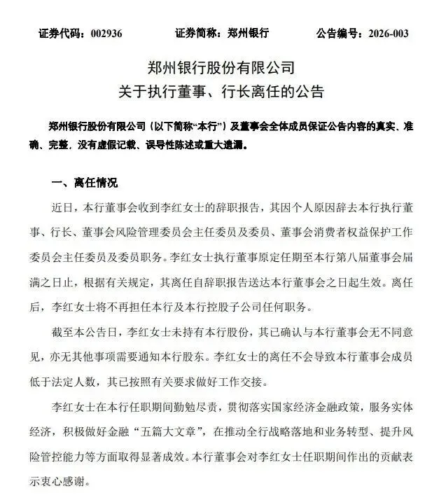 前不久郑州银行通过公告宣布李红因个人原因辞去执行董事、行长及董事会相关专门委员会职务。这位任职刚满一年的女行长正式卸任,引发外界对该行高管团队及治理结构的关注。