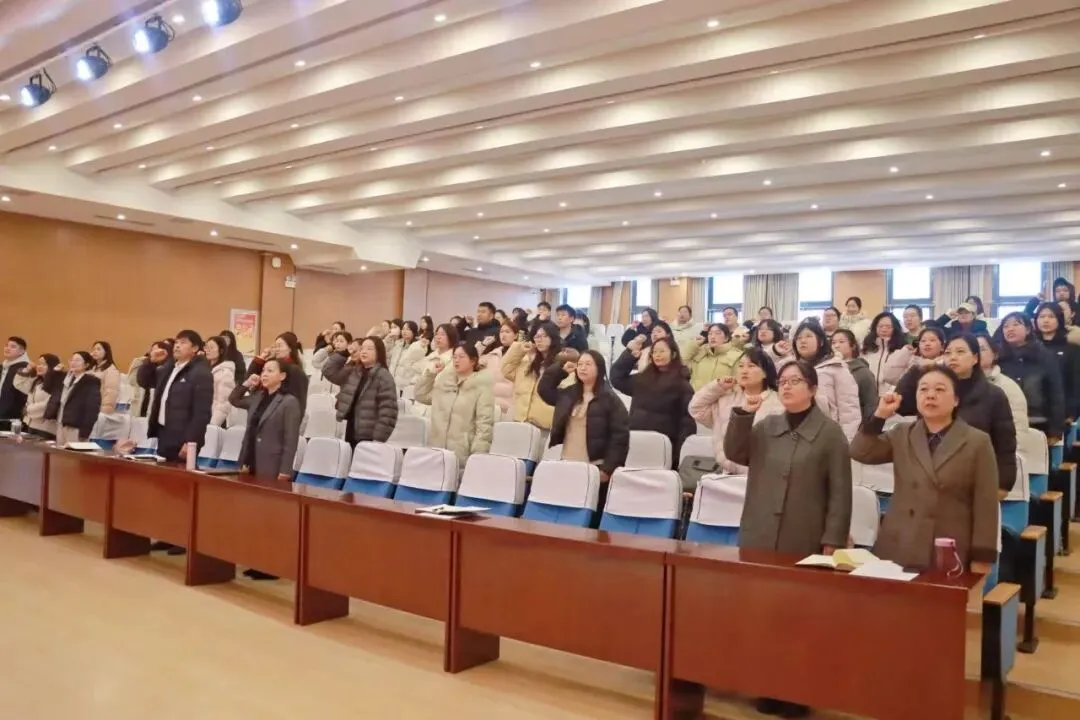 会议最后,副校长麦素琴带领全体教职工庄严宣誓。教职工高举右拳,誓词铿锵有力,饱含对教育事业的忠诚,凝聚着立德树人的坚定信念。这一声声宣誓,是全体教师对教育初心的坚守、对育人使命的承诺,更凝聚起携手奋进的强大力量,让每一位教师深受鼓舞、勇担重任。