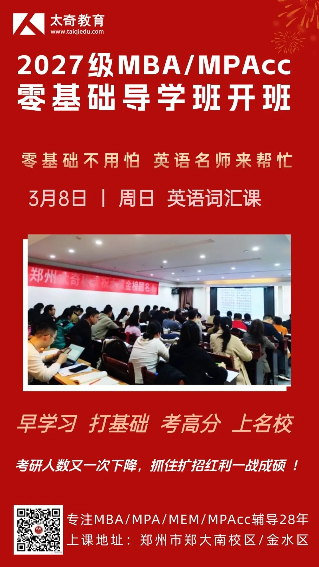 【27考研上课通知】郑州太奇考研27MBA零基础导学班3月8日开课