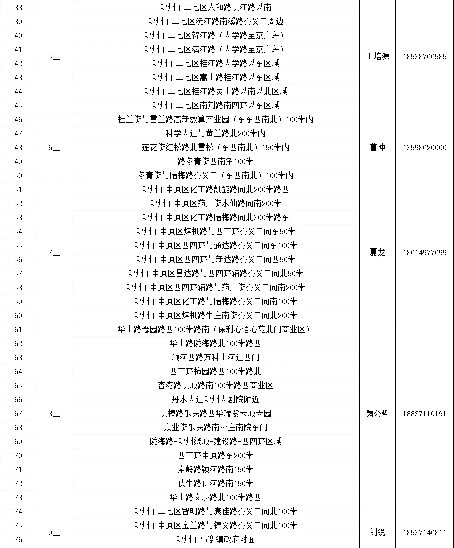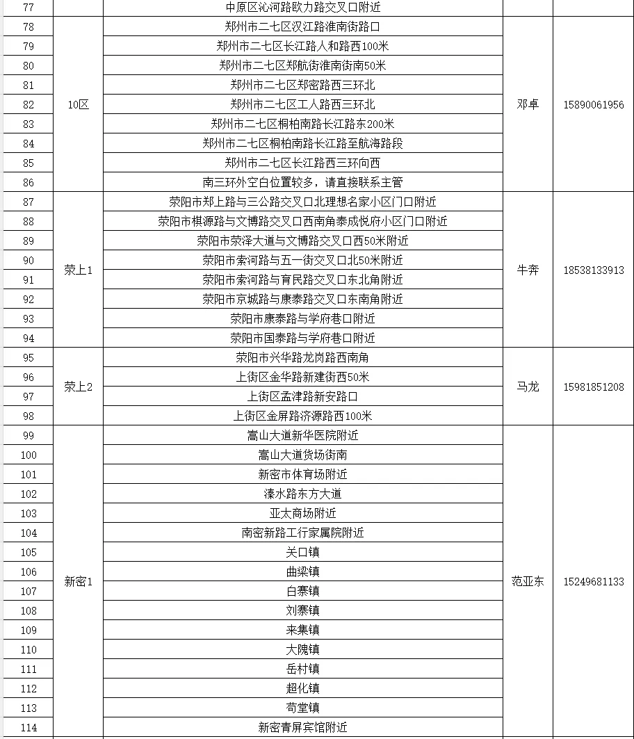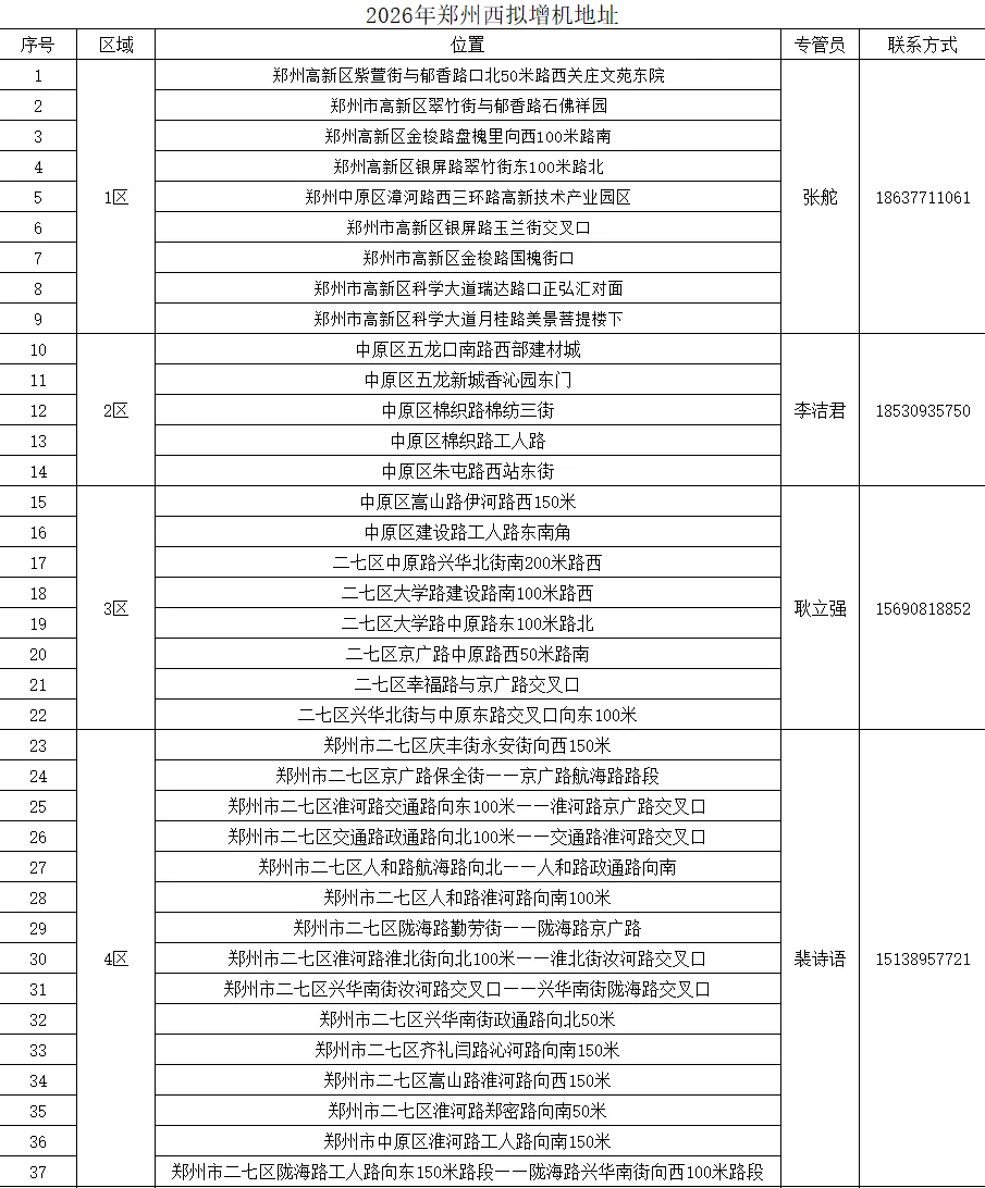 各区域空白位位详情及专管员联系方式,可参考《2026年郑州西拟新增机地址明细表》。