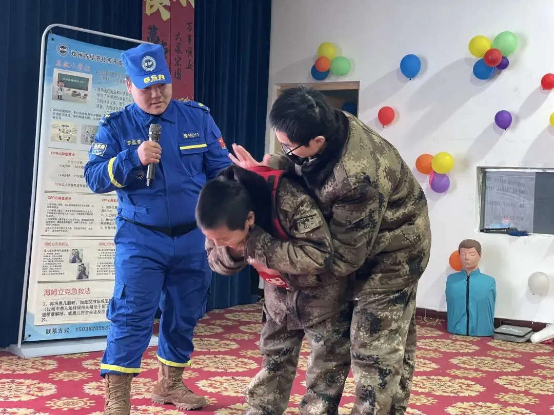 👐 实操演练:手把手,打破“会看不会做”的壁垒纸上得来终觉浅,绝知此事要躬行。为了让大家真正掌握动作要领,蓝天救援队的队员们将“模拟人”搬上讲台,进行了标准的心肺复苏现场演示。“双手十指相扣,掌根重叠,手臂绷直,用上半身的力量垂直向下压……”“频率要快,深度要够,跟着我的节奏:01、02、03……”在演示海姆立克急救法时,队员们更是邀请了在场学生配合,生动展示了“剪刀、石头、布”的定位手法,针对成人及婴幼儿气道异物梗阻的不同处理方式进行了区分讲解,确保大家听得懂、学得会。