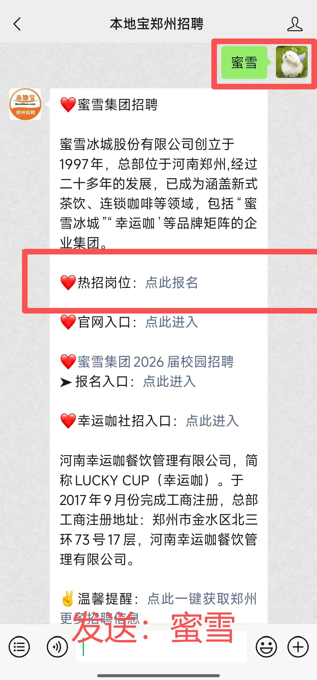 可进入蜜雪冰城招聘官网或智联进行报名,推荐扫描下方二维码关注【本地宝郑州招聘】微信公众号并在对话框发送【蜜雪】即可直达报名入口、获取岗位条件等