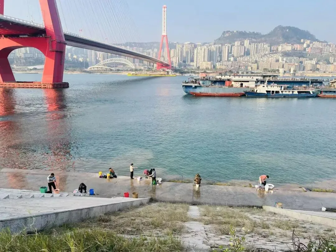 如果说重庆主城区是城市化、现代化的魔幻之都,那万州则更多地保留了山河本色与本地人的生活气息的魔都。在主城区看到的是游轮,这里则看到的货轮。在主城区看到的是干净有序的江边公园,这里则看到的是人们有条不紊的生活:江边洗衣、江边垂钓、大爷冬泳。