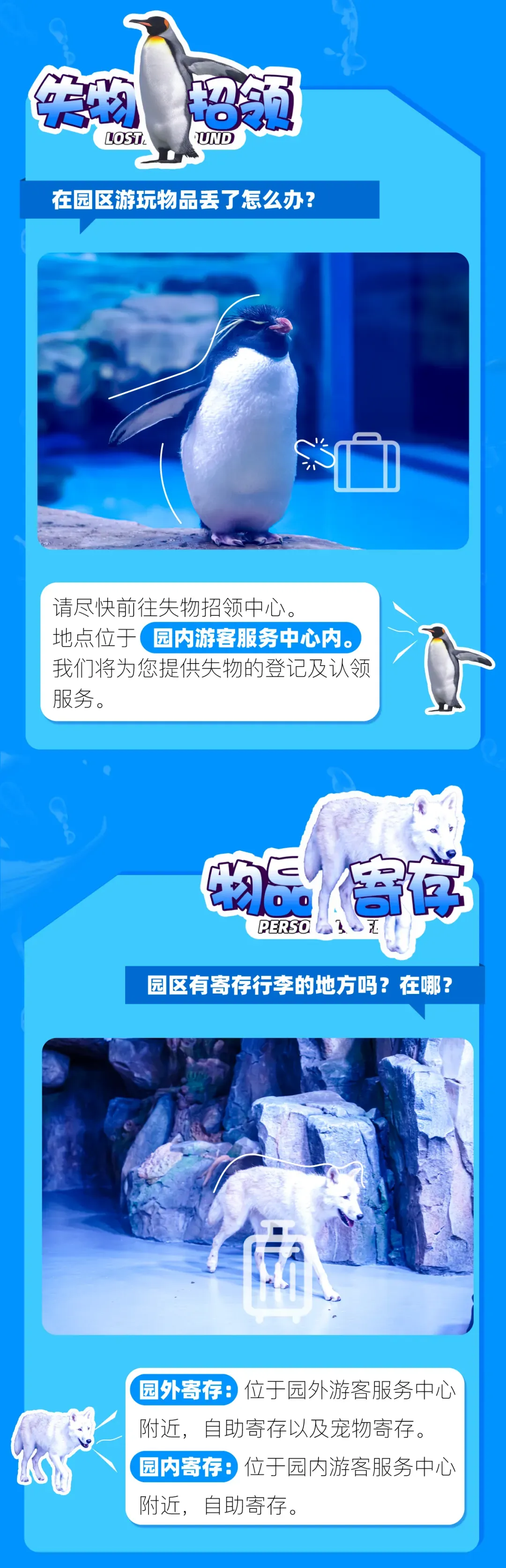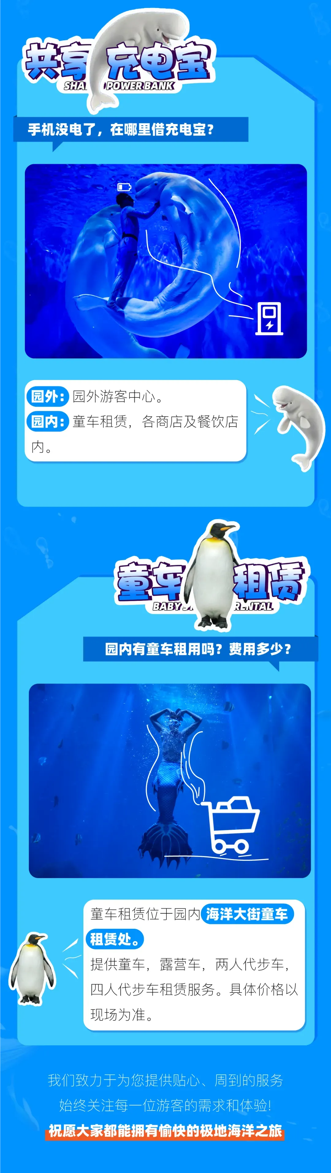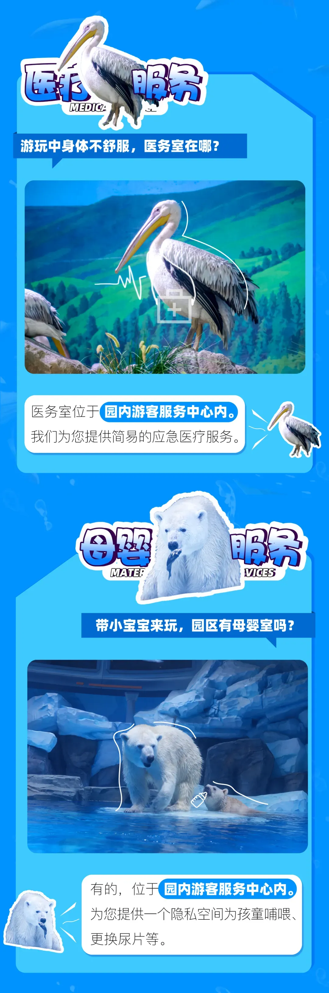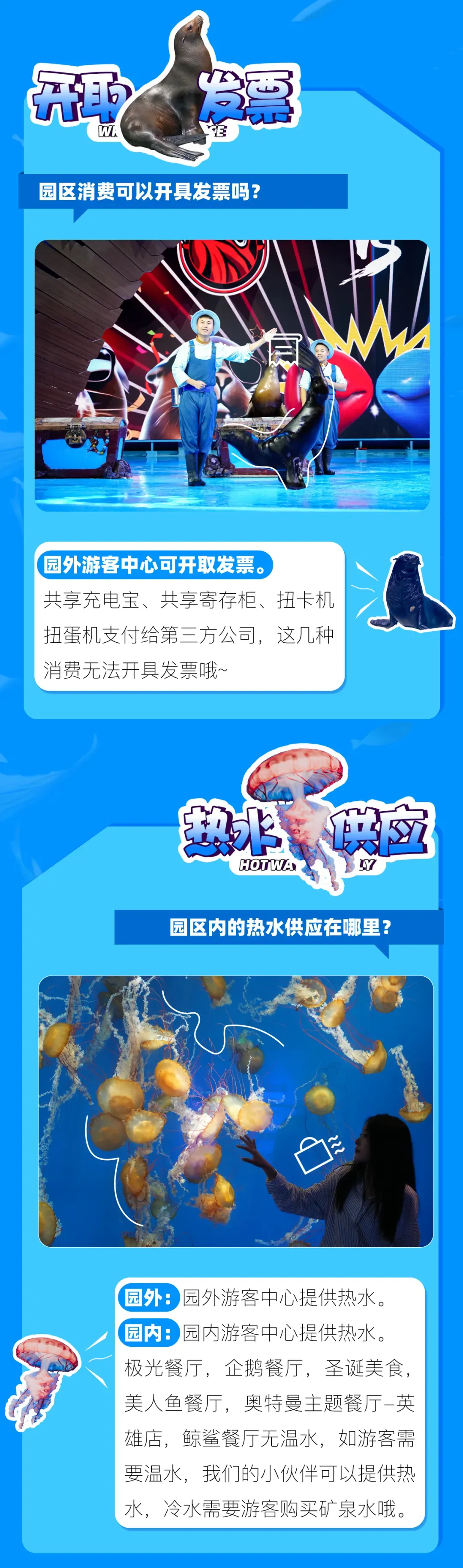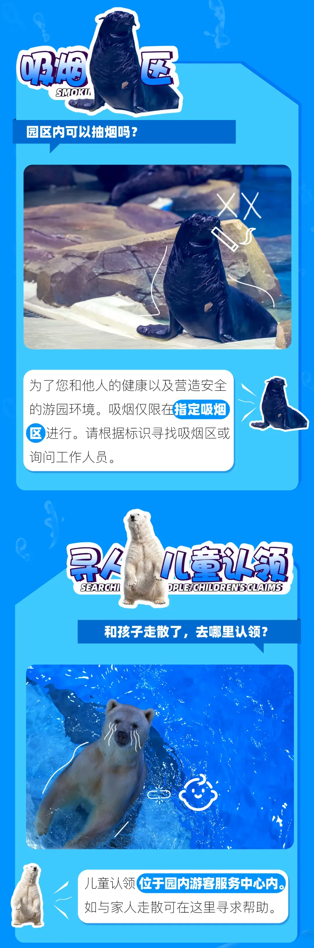 6.公园将游客安全视为首位,公园可根据园区游客量、天气状况或特定节目而基于治安规定、安全秩序或者公园认为必要的情况下,不定时更改园区内游乐设备、剧场开关时间以及限制客流控制入园人数等将不做另行通知,亦不做任何退款或赔偿。如遇公园进行重要接待或大型活动时,园内项目也将临时调整,包括但不限于投喂、讲解及动物状况等部分区域封闭,请您留意公园当日公告或广播。
