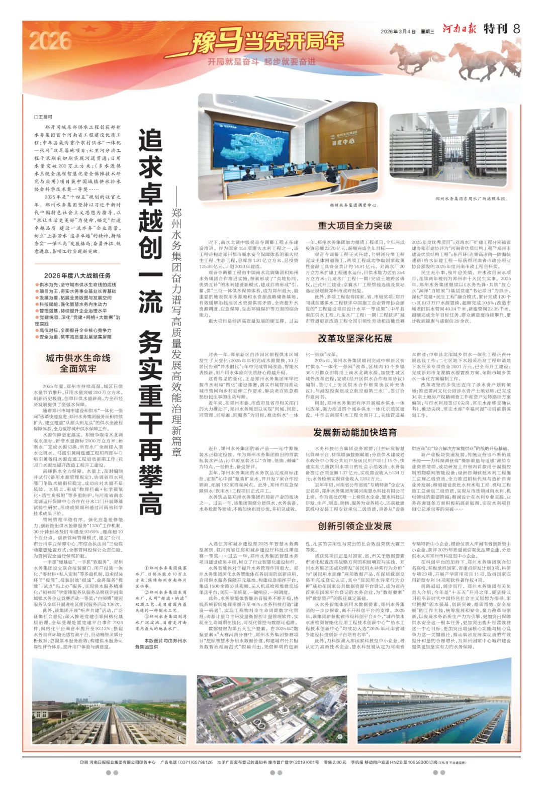 前路迢迢,阔步而行。郑州水务集团有关负责人介绍,今年是“十五五”开局之年,要坚持以习近平新时代中国特色社会主义思想为指导,牢牢把握“固本强基、创新突破、提质增效、安全发展”的工作主线,统筹发展和安全,聚力改革与创新,以发展水务新质生产力为引擎,更加突出保障供水安全这一根本任务,更加突出提升经营效益这一中心目标,更加突出增强核心功能与核心竞争力这一关键路径,推动集团发展实现质的有效提升和量的合理增长,为郑州国家中心城市建设提供更加坚实有力的水务保障。